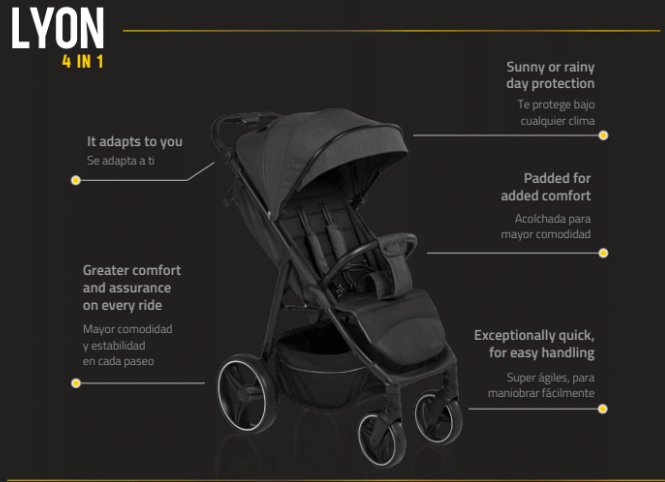 Además incluye cobertor para la lluvia y mosquitero.