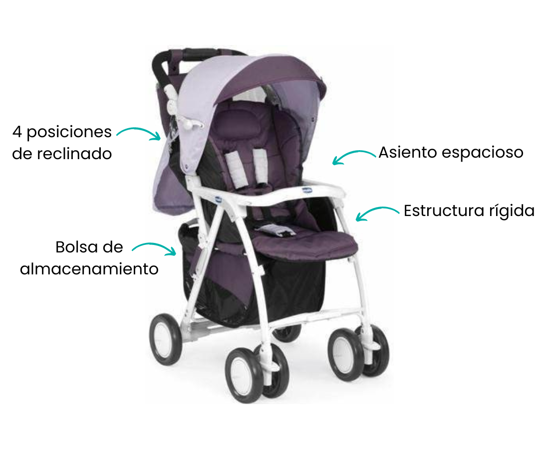 Se reclina en cuatro diferentes posiciones, ofreciendo flexibilidad de ajustarse hasta llegar a una posición totalmente horizontal, brindando un descanso cómodo al bebé. Se abre y cierra con una sola mano, permitiendo una máxima maniobrabilidad incluso en espacios estrechos.