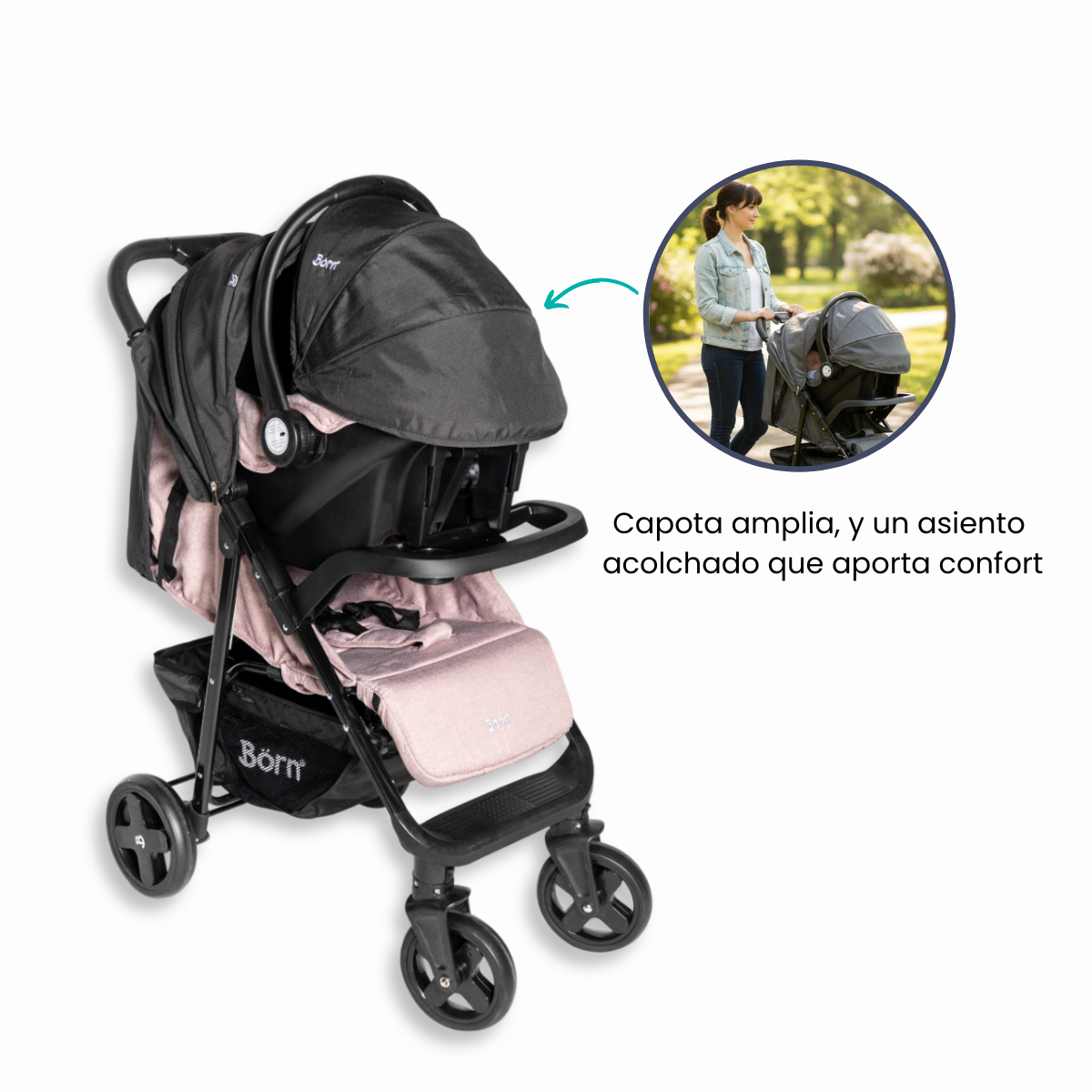 Ideal para padres que buscan comodidad y estilo sin complicaciones, este coche de paseo con portabebé integrado está pensado para hacer más simples las salidas con tu bebé. Su diseño compacto, moderno y de tonos neutros se adapta fácilmente a distintos entornos, brindando un look elegante y funcional para cualquier ocasión.