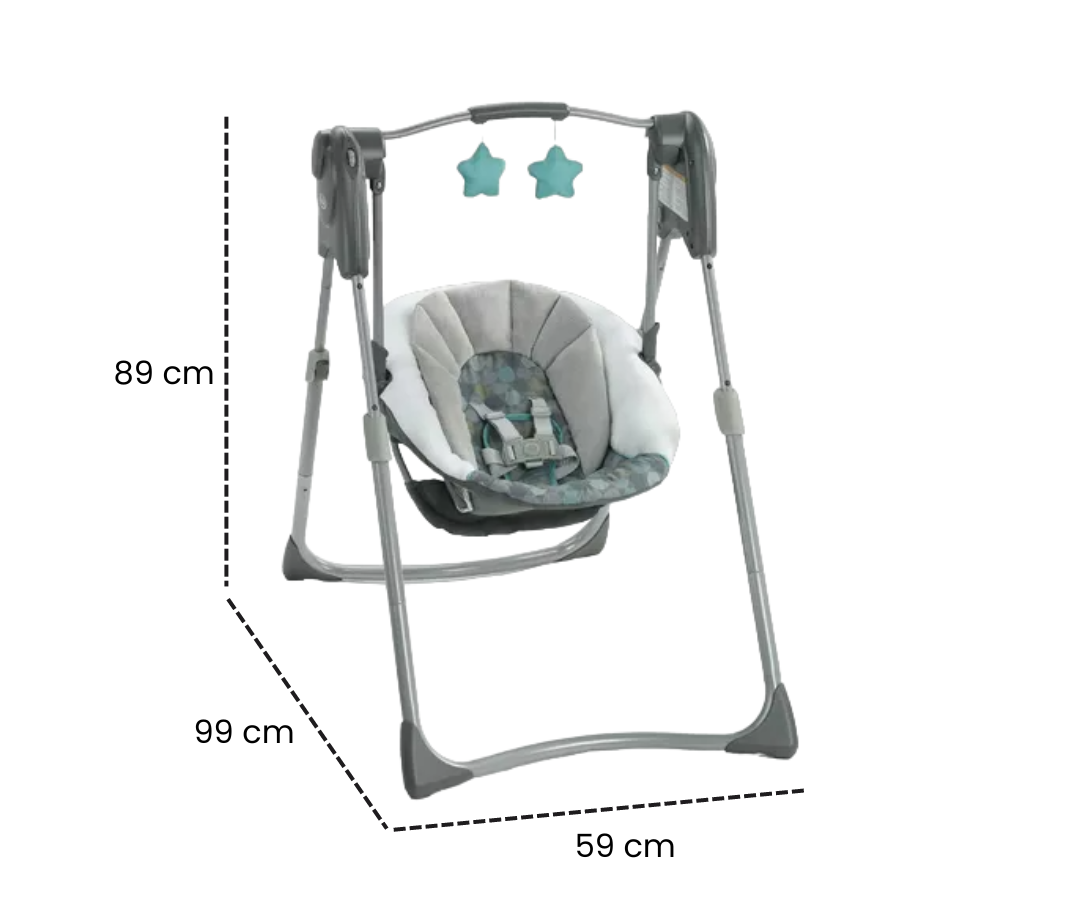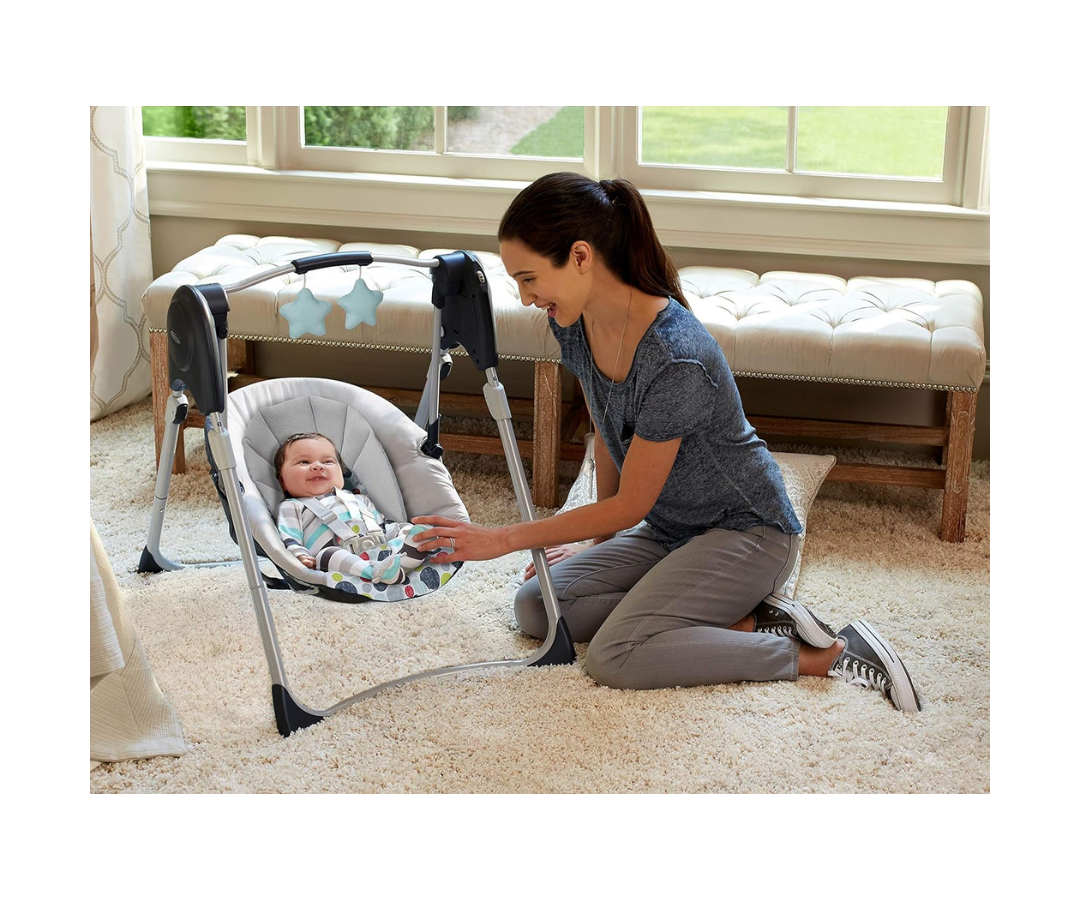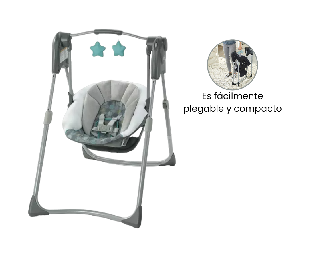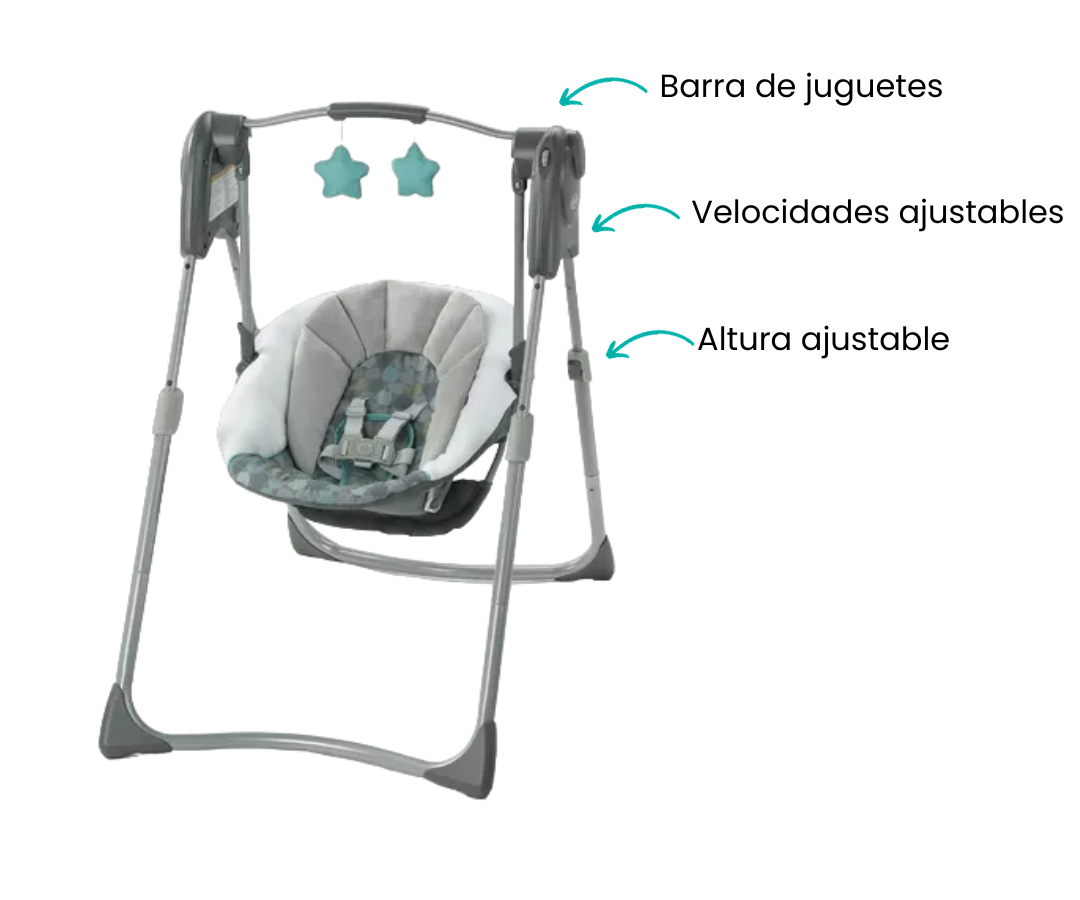 Es fácilmente plegable y compacto para su almacenamiento. Tiene velocidades de oscilación ajustables, permitiendo encontrar el ritmo perfecto al estado de ánimo del bebé. Además, la barra de juguetes cuenta con dos juguetes suaves diseñados para atraer y estimular visualmente al bebé.