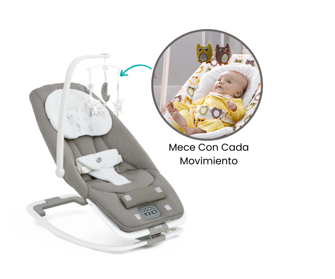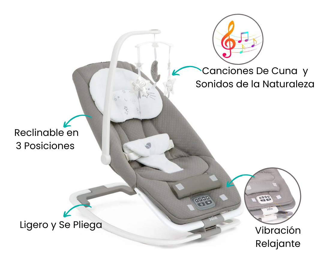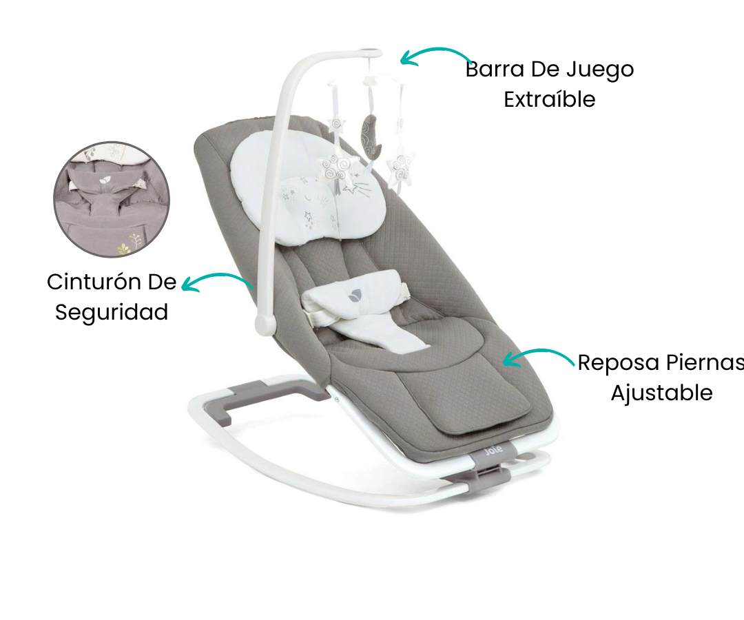 El bouncer incluye un arco de juguetes desmontable que cuelga sobre el asiento, ofreciendo entretenimiento interactivo para tu bebé. Estos juguetes colgantes no solo estimulan sus sentidos, sino que también fomentan la coordinación mano-ojo mientras intentan alcanzar y agarrar los objetos. Una manera divertida y educativa de mantener a tu pequeño comprometido y desarrollando habilidades motoras desde una edad temprana.