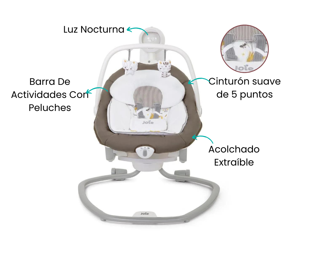 Descubre la serenidad con los Columpios Serina 2in1 - Cozy Spaces, calmando a tu bebé con su balanceo personalizable: adelante y atrás o de lado a lado. Además, la versatilidad es clave, ya que el asiento se puede quitar para convertirse en una tumbona independiente, brindando comodidad en cualquier lugar.