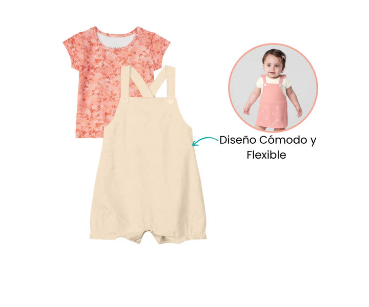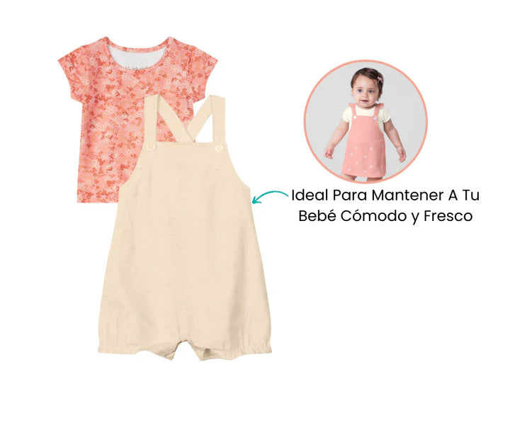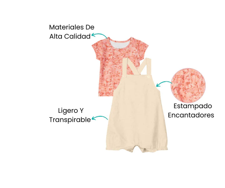 Este adorable conjunto para bebé niña incluye una blusa y una jardinera confeccionados con tejido suave, ofreciendo un look fresco y encantador para los días cálidos. La blusa cuenta con detalles delicados y un diseño holgado que brinda comodidad, mientras que el pantalón corto es ligero y fácil de llevar.