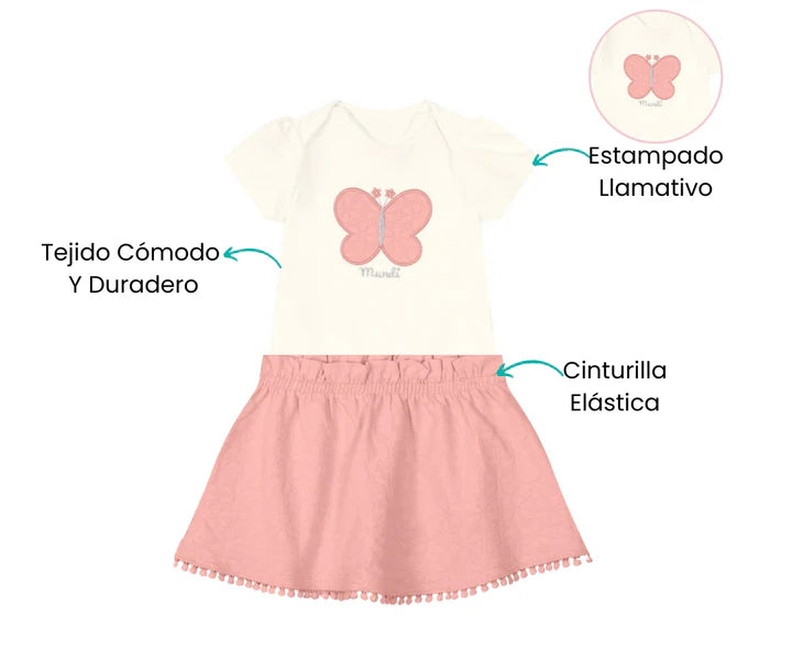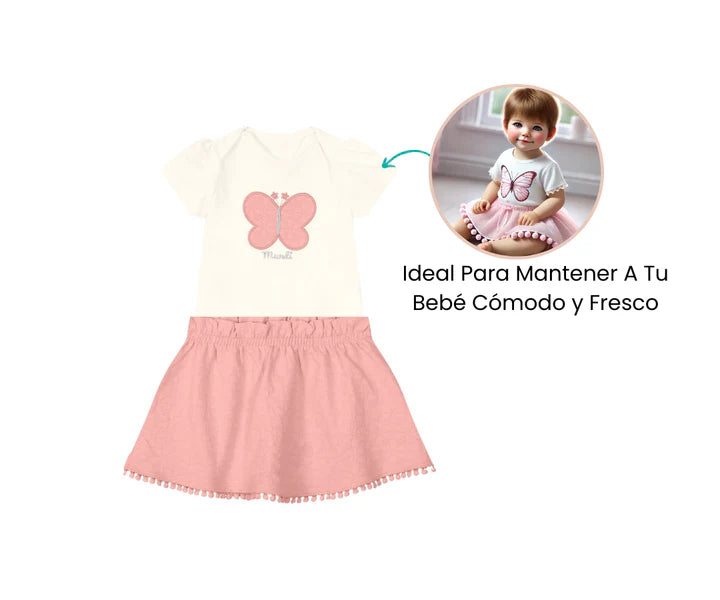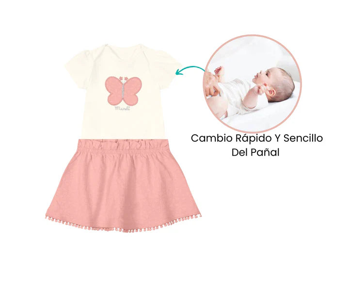 Este encantador conjunto de body y falda para niña combina estilo y comodidad en una sola prenda. El body, confeccionado en materiales suaves y transpirables, garantiza el confort necesario para la piel delicada de las pequeñas. Su diseño incluye broches en la parte inferior, lo que facilita vestir y cambiar al bebé.