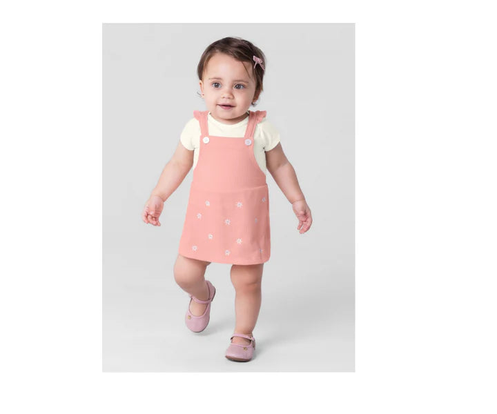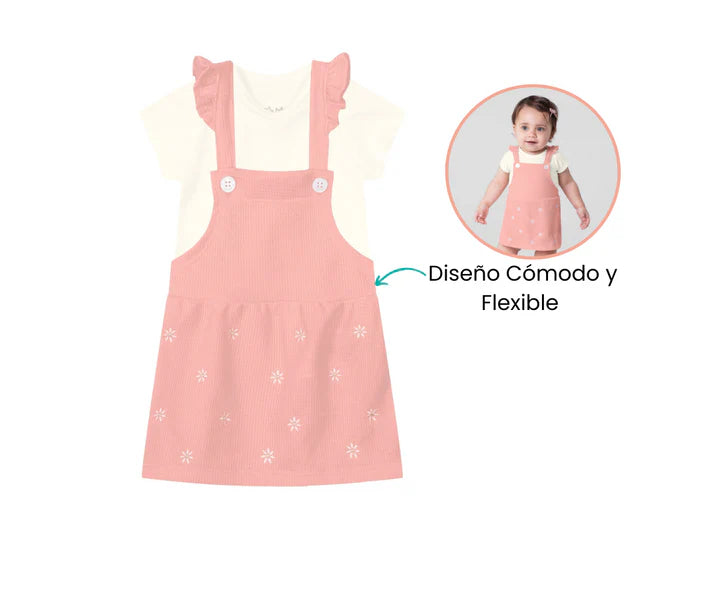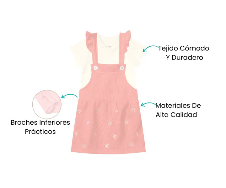 Este encantador conjunto de body y mini vestido es ideal para que tu pequeña luzca adorable en cualquier ocasión. El body, confeccionado en materiales suaves y transpirables, proporciona comodidad durante todo el día y es perfecto para la piel delicada de los bebés. Incluye prácticos broches en la parte inferior, lo que facilita vestir y cambiar a la niña con rapidez.