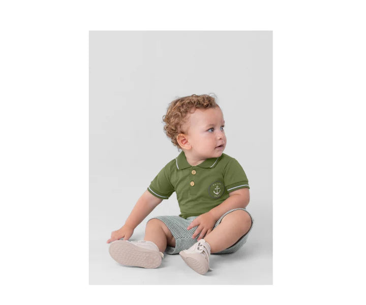 El conjunto es perfecto para los días de sol, combinando estilo y comodidad en cada detalle. La camiseta está diseñada con un suave tejido que permite una ventilación ideal, manteniendo fresco al bebé mientras juega.