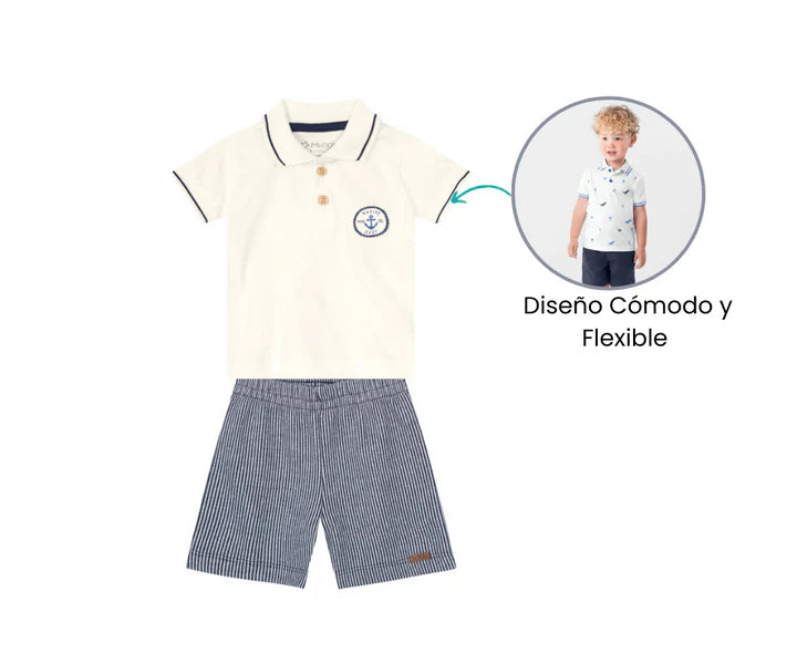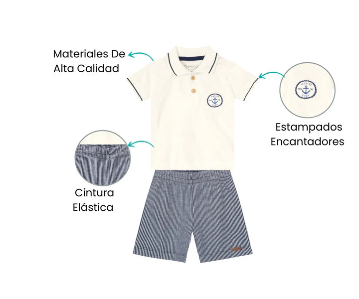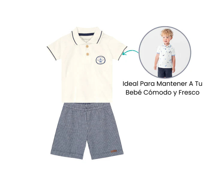 El conjunto es perfecto para los días de sol, combinando estilo y comodidad en cada detalle. La camiseta está diseñada con un suave tejido que permite una ventilación ideal, manteniendo fresco al bebé mientras juega.