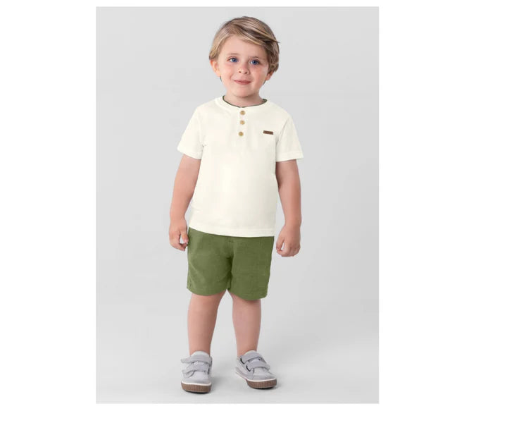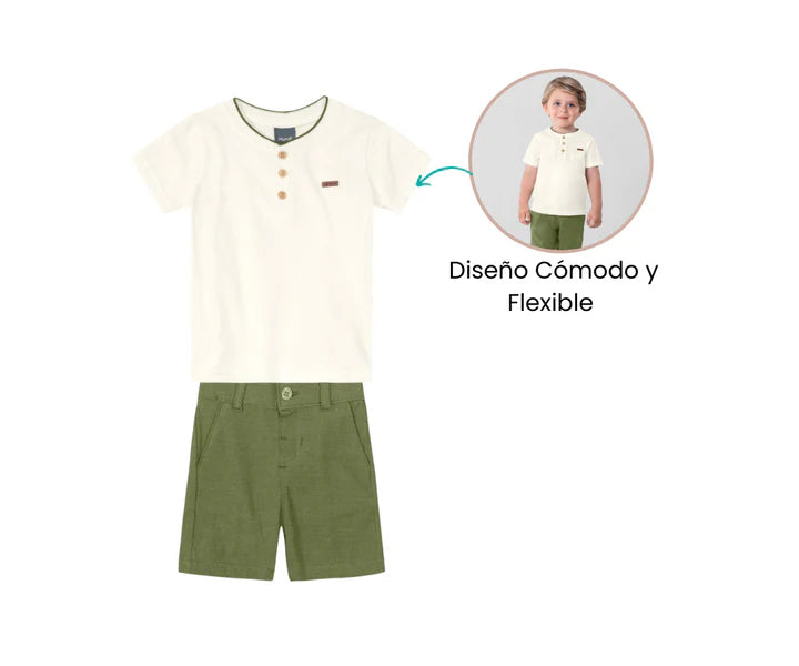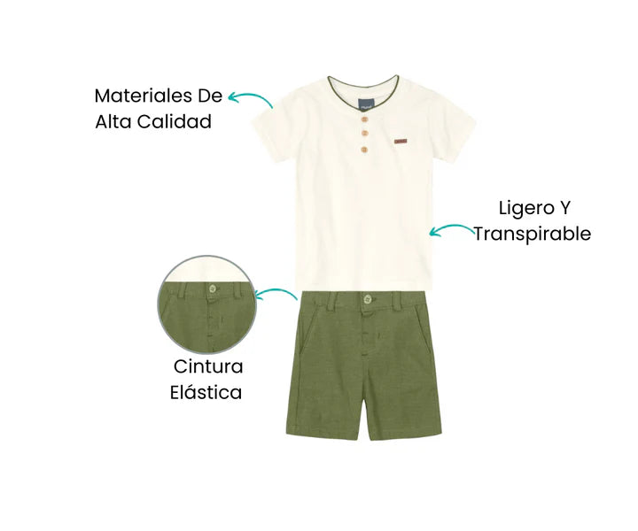 El conjunto es perfecto para los días de sol, combinando estilo y comodidad en cada detalle. La camiseta está diseñada con un suave tejido que permite una ventilación ideal, manteniendo fresco al bebé mientras juega.