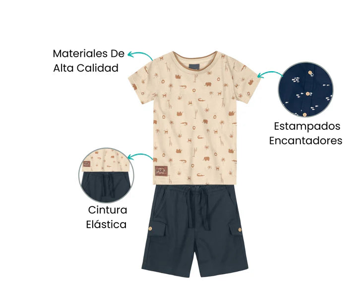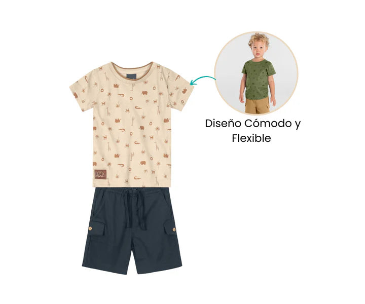 El conjunto es perfecto para los días de sol, combinando estilo y comodidad en cada detalle. La camiseta está diseñada con un suave tejido que permite una ventilación ideal, manteniendo fresco al bebé mientras juega.