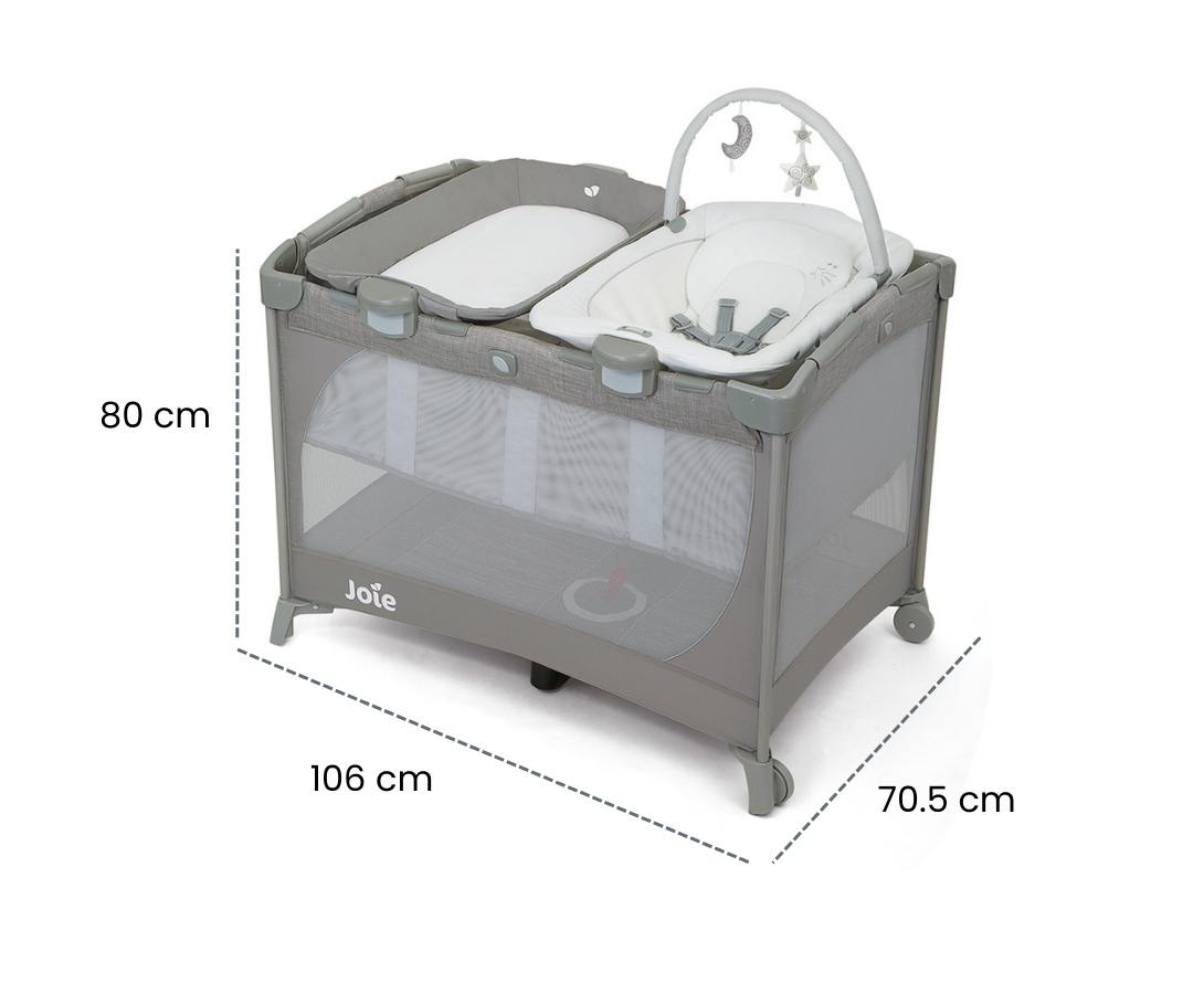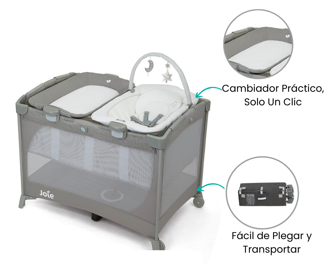 Viajar con tu bebé es más fácil que nunca con el cómodo corral. El cambiador se coloca y quita con un rápido clic, facilitando las tareas de pie y brindando accesibilidad instantánea. Además, cuenta con un elevador de tamaño completo perfecto para jugar y dormir. Este corral no solo mantiene entretenidos a los pequeños durante el juego, sino que también asegura dulces sueños a la hora de la siesta.