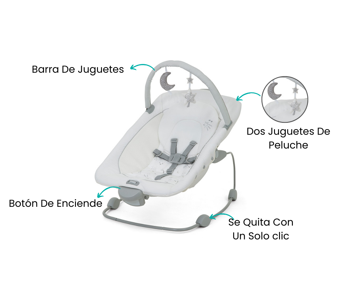 El corral incluye un Bouncer que retira con un clic rápido para transiciones sin complicaciones y viajes sin estrés. Viene con una barra de juguetes cubierta de tela y dos adorables peluches, asegurando que mantener al bebé entretenido sea tan fácil como jugar.