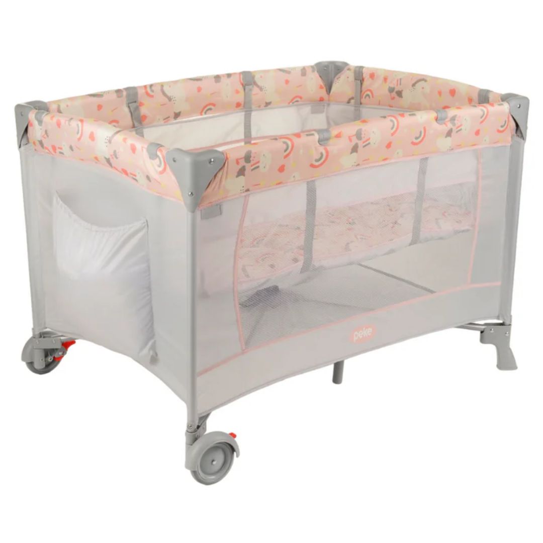 Diseño plegable con ruedas y frenos para transportar y guardar fácilmente la cuna Peke.