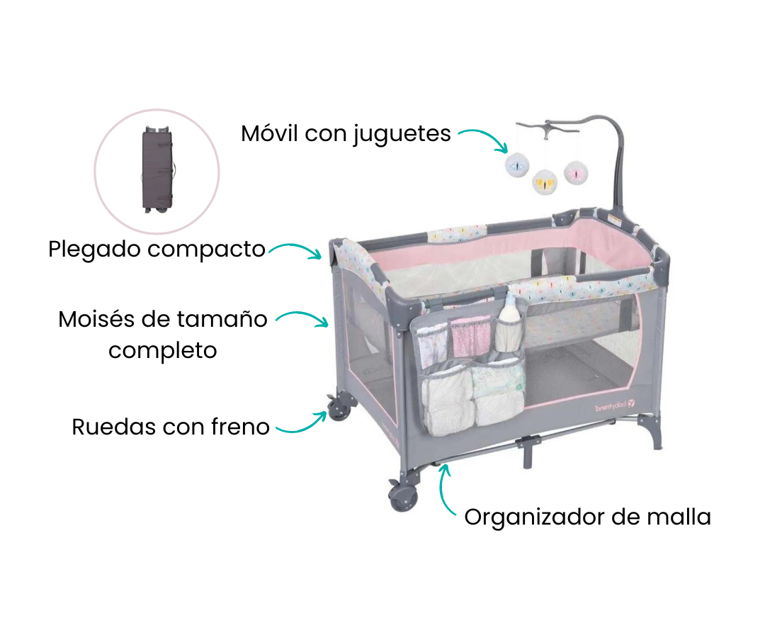 Además, cuenta con un organizador de malla para padres para tener todo a mano. Con ruedas con freno y un plegado compacto, este centro ofrece movilidad y estabilidad. ¡Tu pequeño disfrutará de un mundo seguro y cómodo mientras descansa y juega en su centro de guardería!