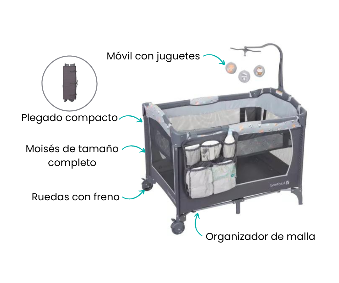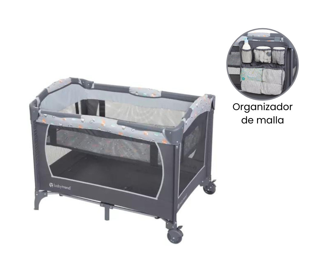 Además, cuenta con un organizador de malla para padres para tener todo a mano. Con ruedas con freno y un plegado compacto, este centro ofrece movilidad y estabilidad. ¡Tu pequeño disfrutará de un mundo seguro y cómodo mientras descansa y juega en su centro de guardería!