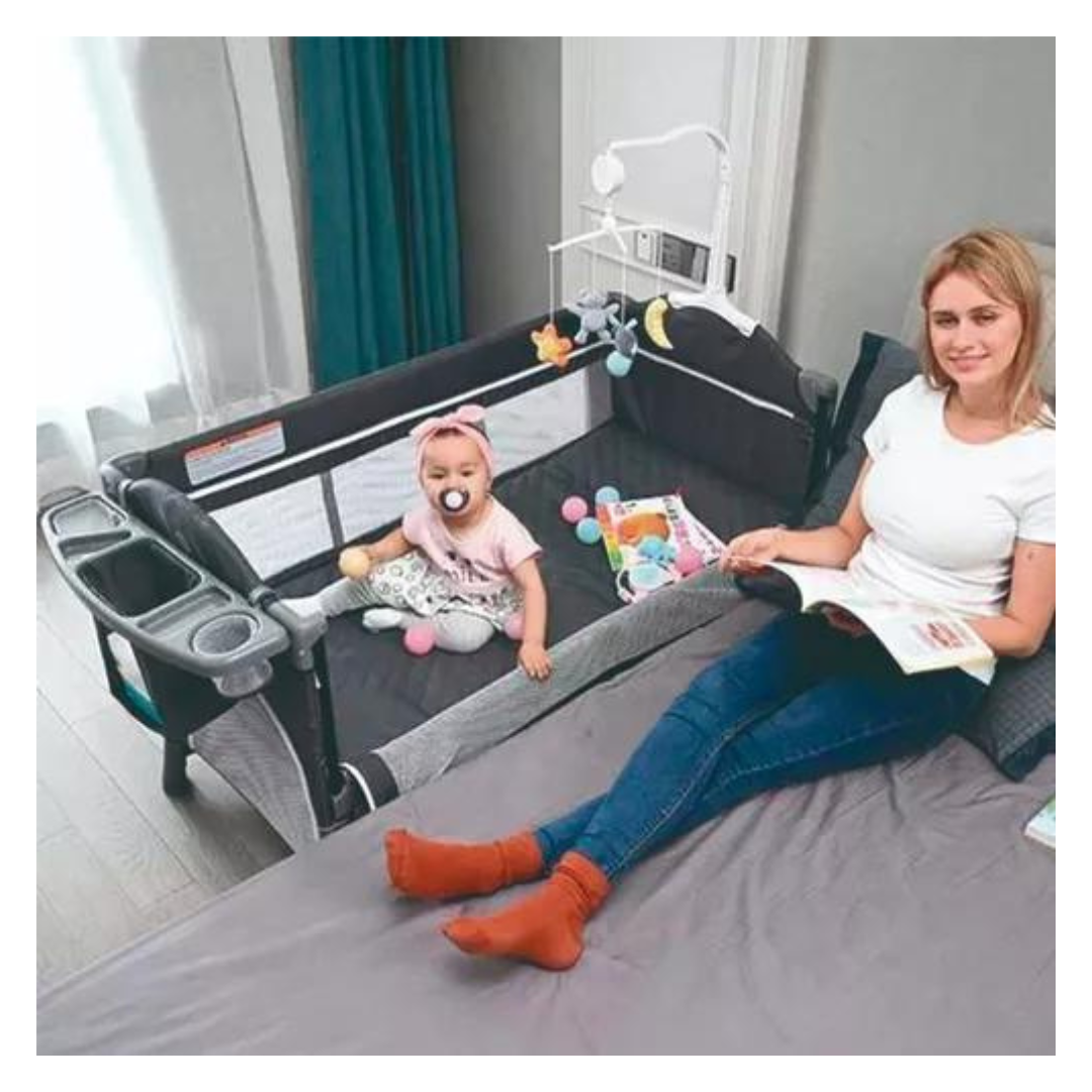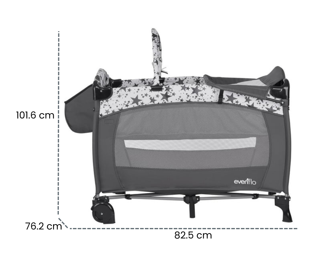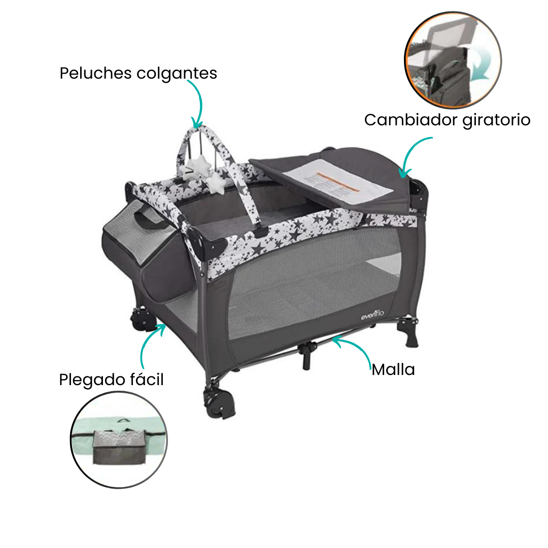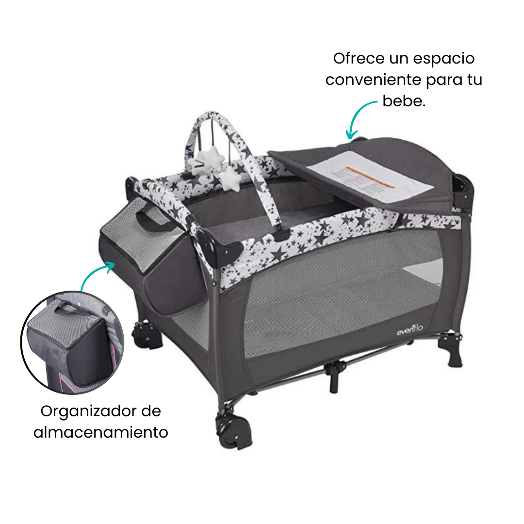 Evenflo Portable BabySuite Deluxe ofrece a los padres un espacio conveniente para el cuidado y juego del bebé. BabySuite ofrece un cambiador giratorio para guardar y un moisés de tamaño completo para mantener cómodo el espacio del bebé. El tapete acolchado se convierte en un tapete de juego con barra de juguetes acoplable para crear un espacio de juego limpio y seguro para su bebé. Un nuevo organizador de almacenamiento ofrece múltiples opciones para guardar los elementos esenciales del bebé.