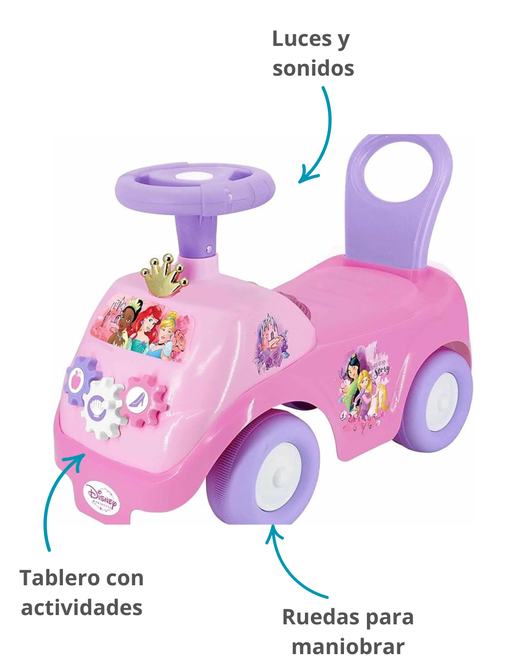 El colorido y detallado auto Disney tiene un tablero interactivo con actividades electrónicas y cuenta con un motor de revolución, bocina y otros sonidos divertidos.