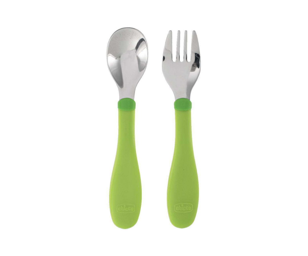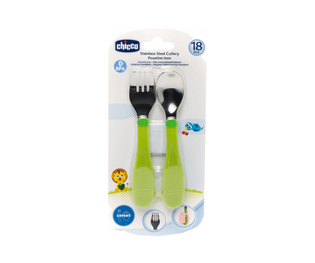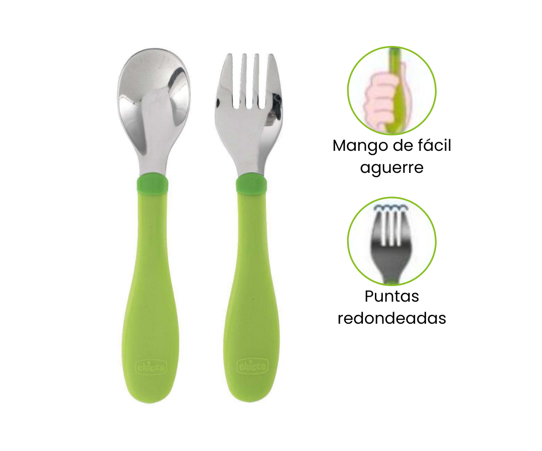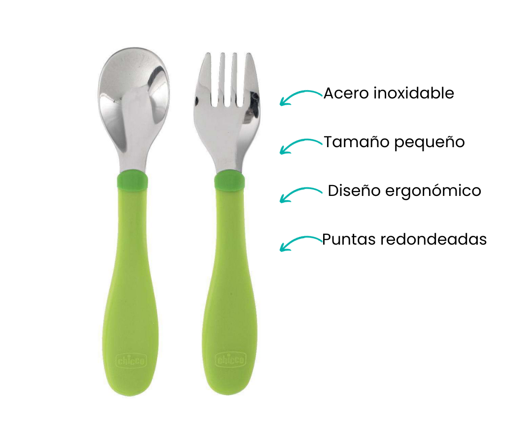 Juego de tenedor y cuchillo diseñados para que él mismo niño pueda manejarlos. Estos cubiertos de acero inoxidable ofrecen una experiencia similar a la de mamá y papá, pero adaptado a su pequeño tamaño.