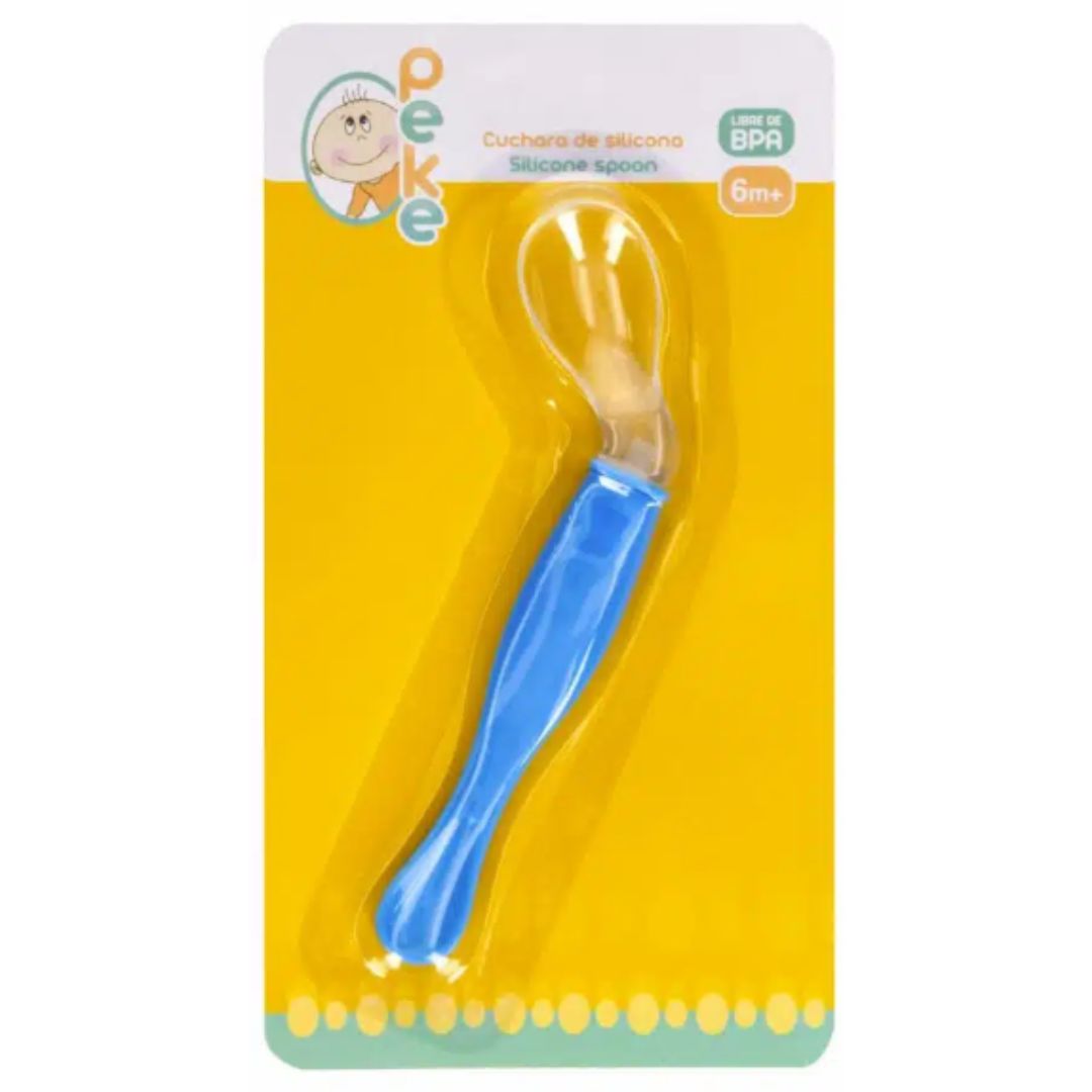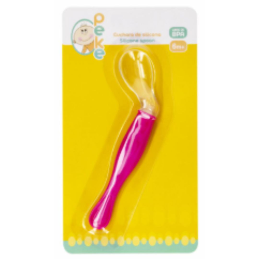 Cuchara curva de silicón flexible y suave para facilitar la alimentación del bebé sin lastimar sus encías.