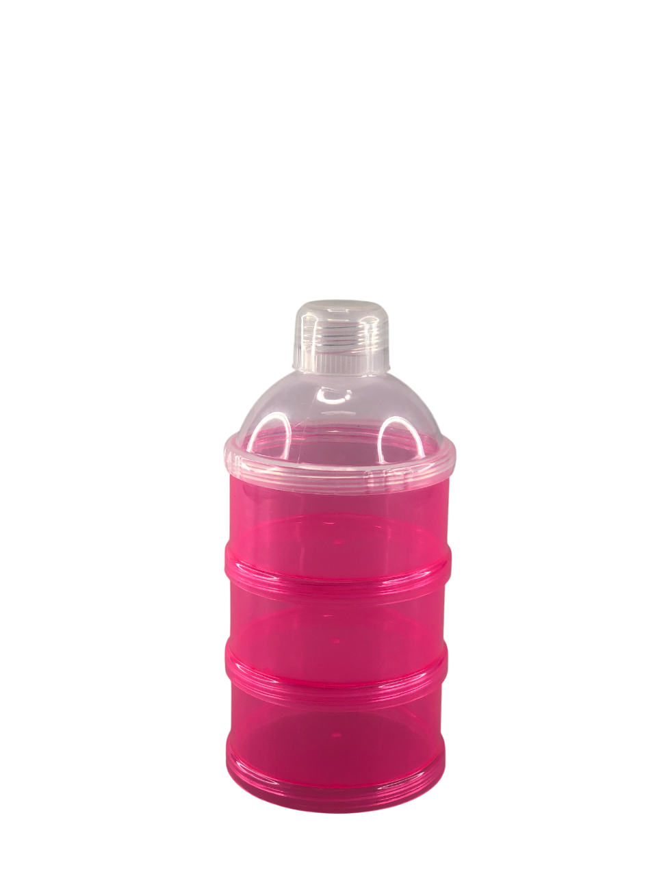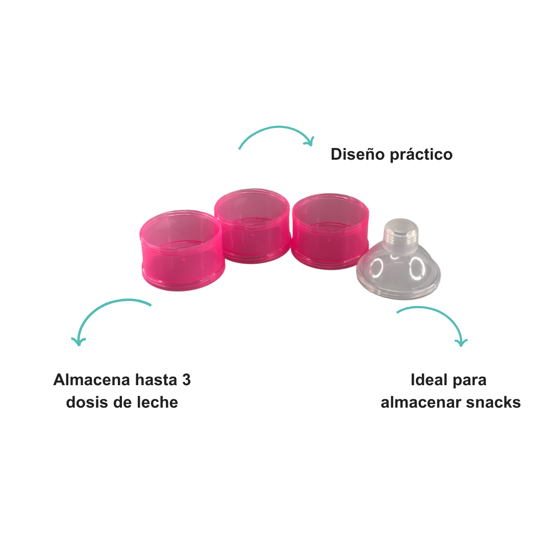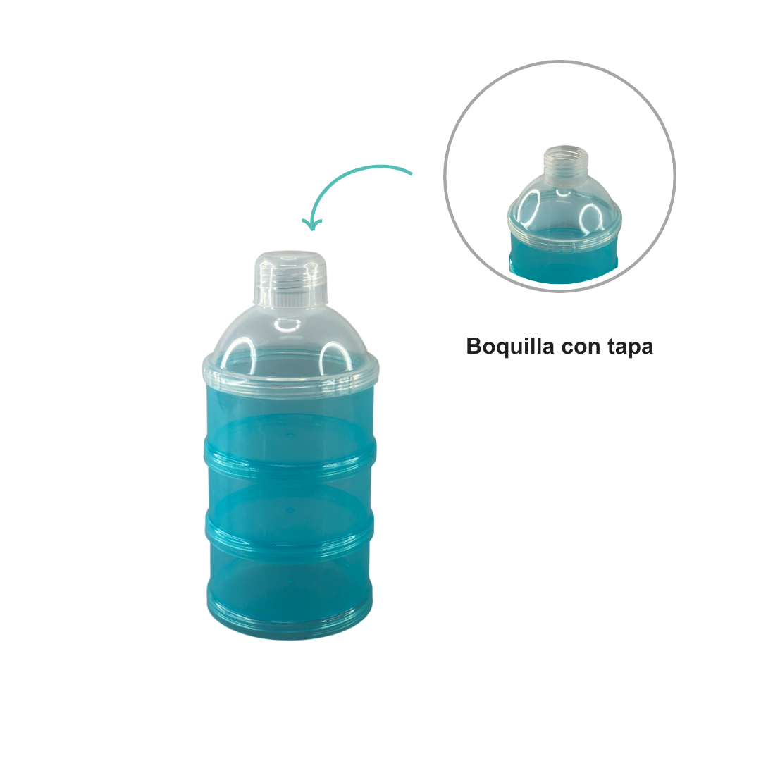 Está dividido en 3 partes para contener las dosis de leche en polvo en compartimentos separados. Incluye boquilla para que sea más practico la distribución de la leche y tomar el contenido exacto.