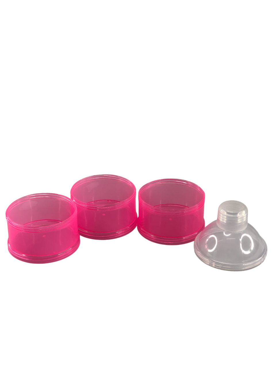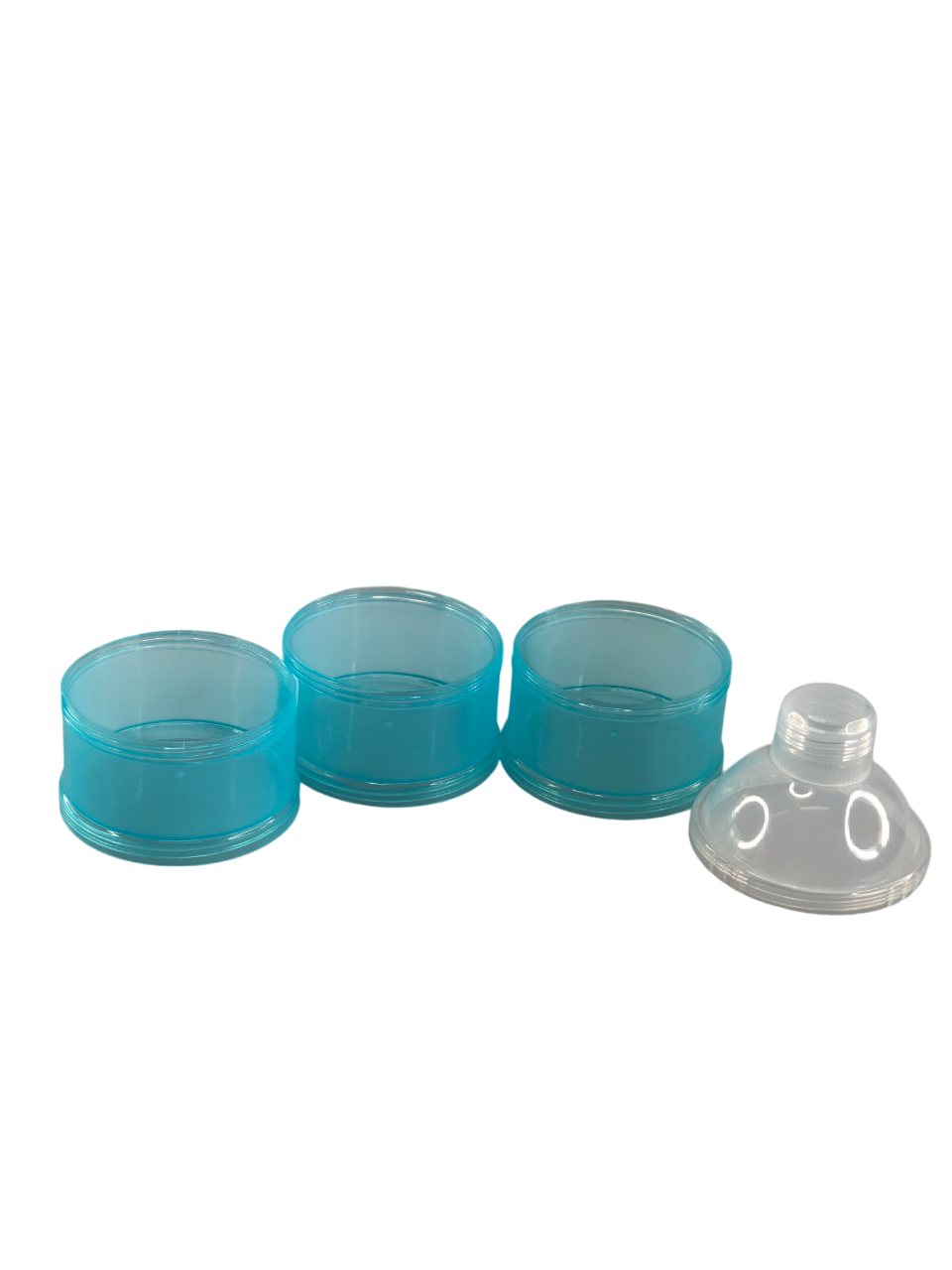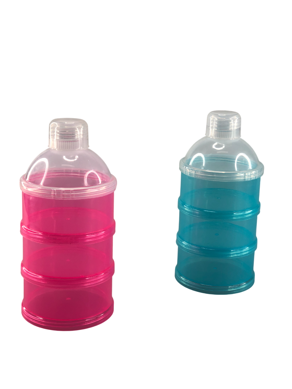 Está dividido en 3 partes para contener las dosis de leche en polvo en compartimentos separados. Incluye boquilla para que sea más practico la distribución de la leche y tomar el contenido exacto.