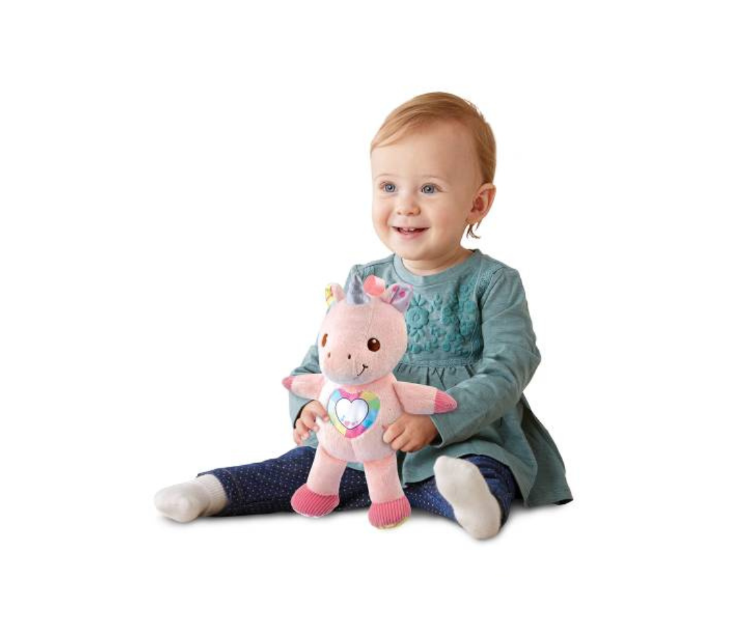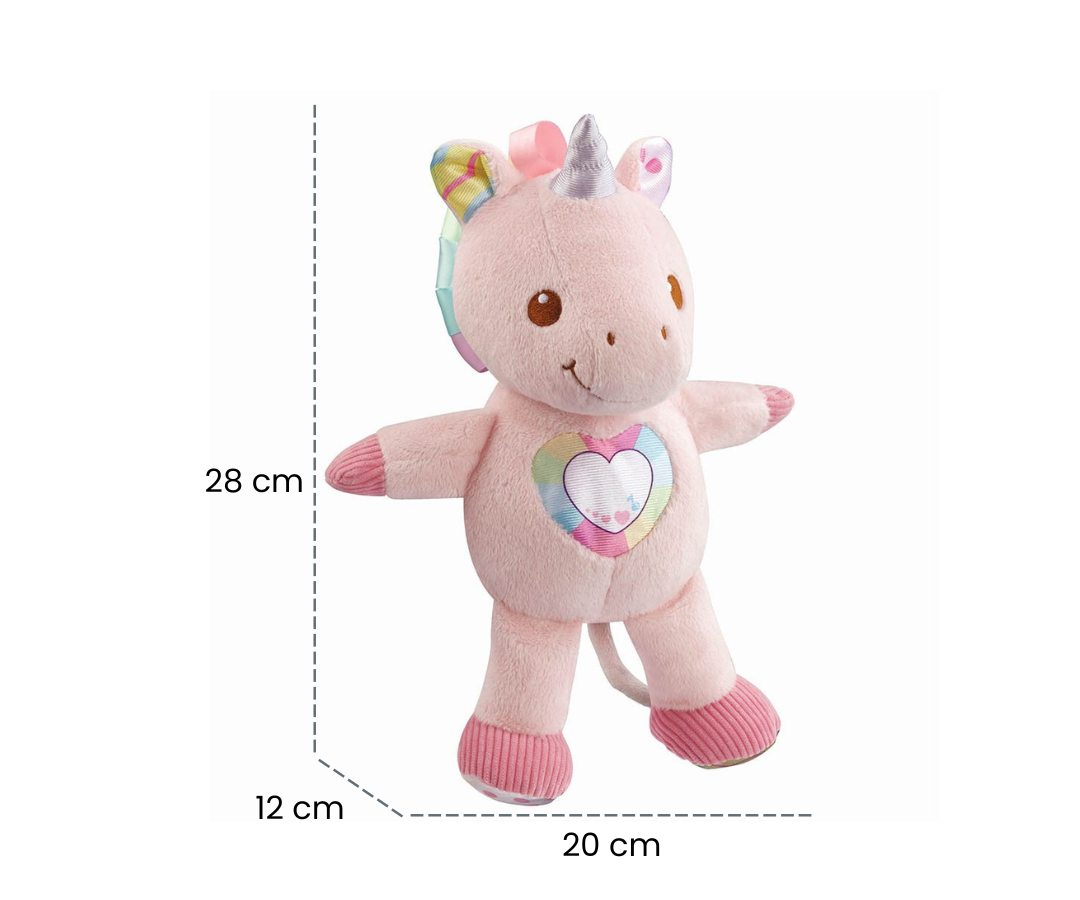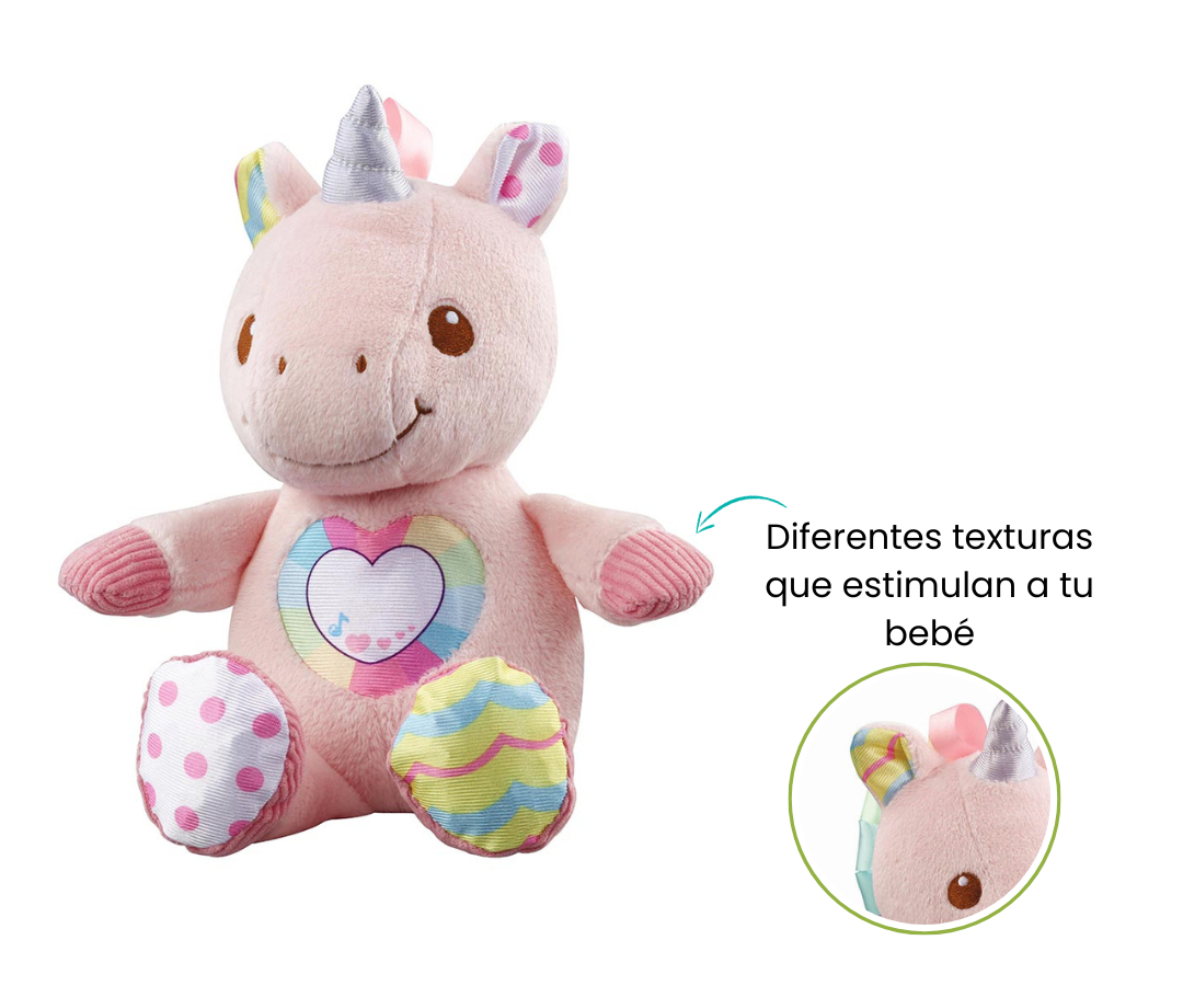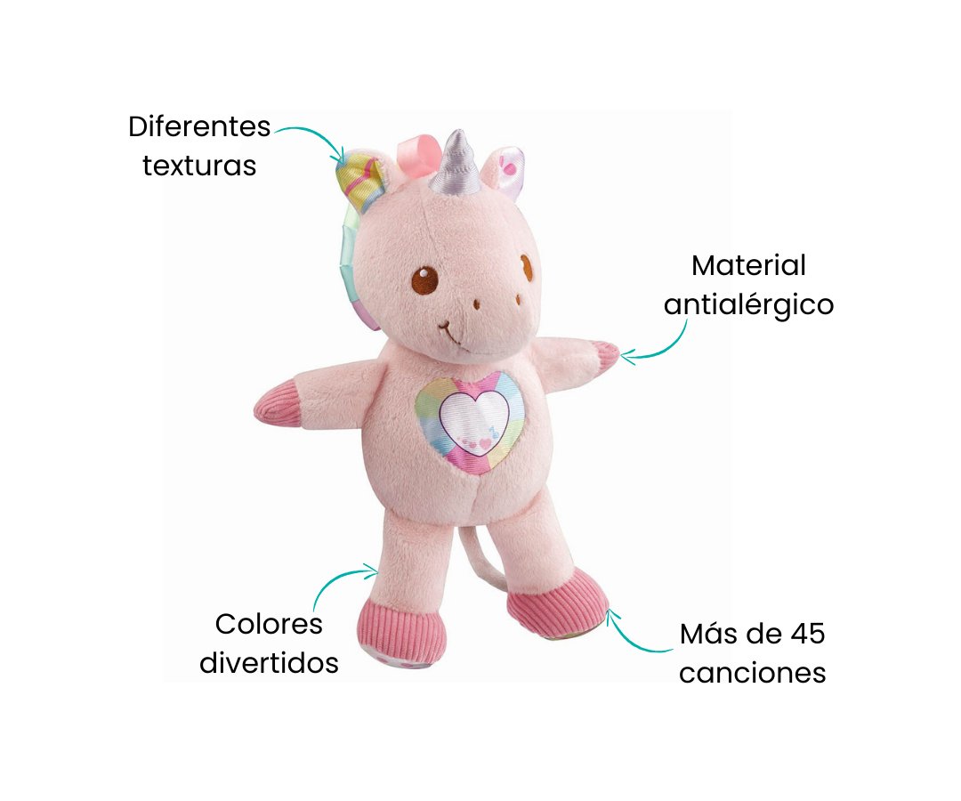 El suave peluche no solo ofrece abrazos mágicos, sino que también presenta diferentes texturas para atraer la atención y estimular el sentido del tacto de tu pequeño explorador. Con 3 canciones y 15 melodías, el Unicornio Cantarín asegura una banda sonora encantadora para sus días y noches.