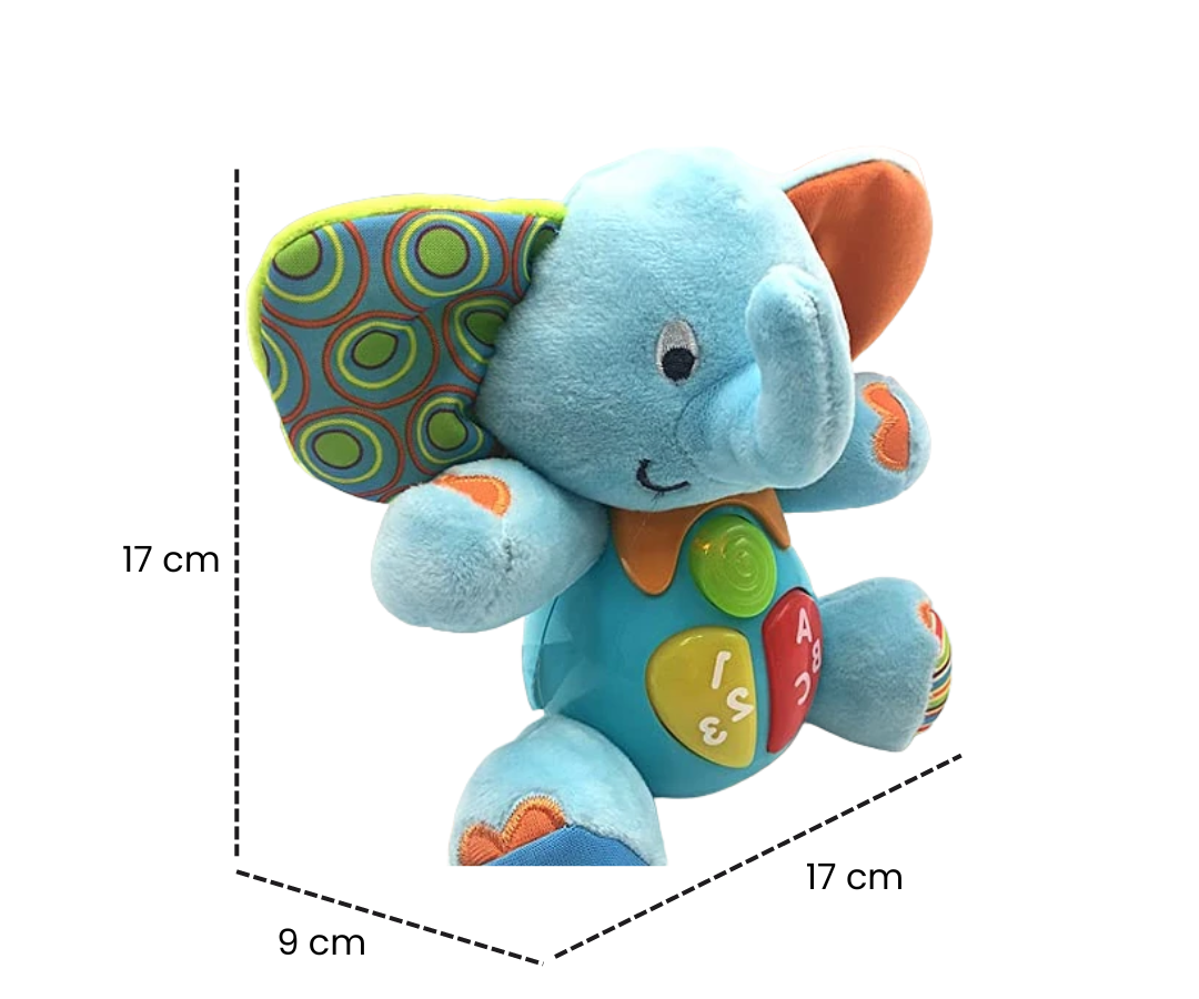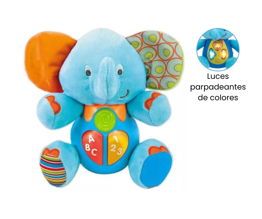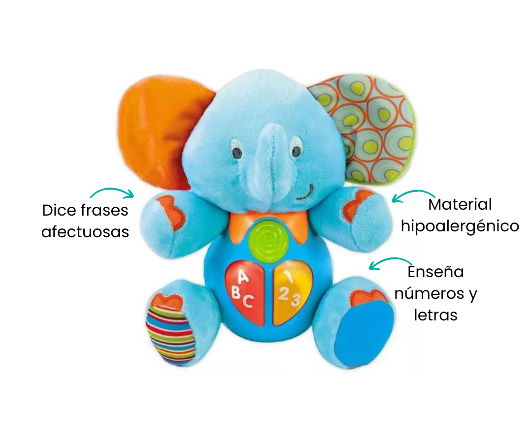 Peluche con forma de elefante que habla, tiene sonidos y luces parpadeantes de colores, el cuál será una fuente de tranquilidad para los mas pequeños, ayudándolos a desarrollar habilidades sociales, promoviendo su imaginación y creatividad.
