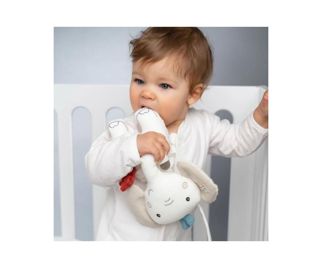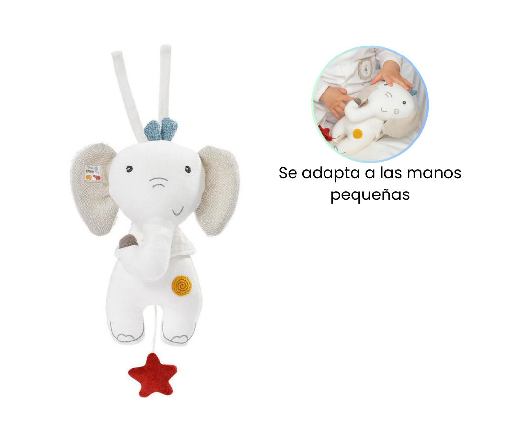 Diseñado para adaptarse perfectamente a las manitas de los bebés, este elefante de tela cuenta con dos correas de sujeción que garantizan que esté firmemente asegurado, ya sea en casa, en la cuna, en el cochecito o en el comedero del bebé.