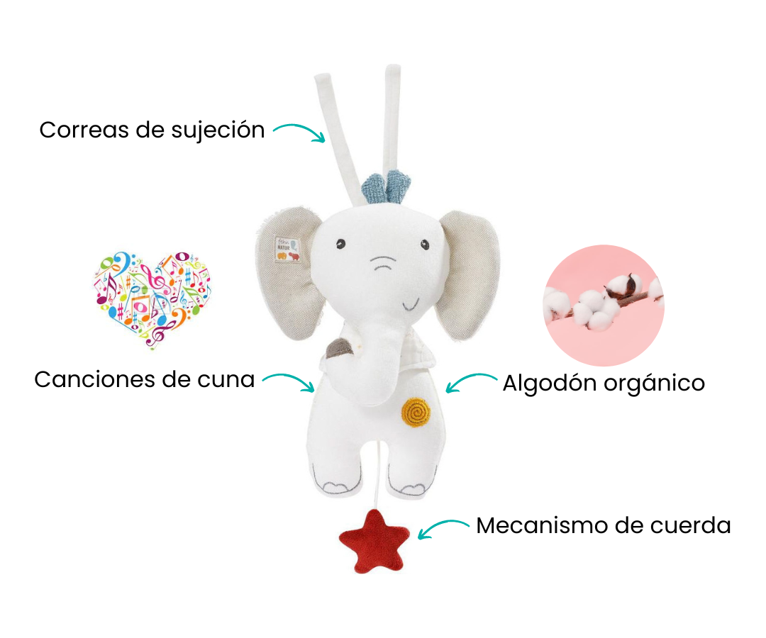 Presentamos al adorable elefante con caja de música, un compañero encantador desde el nacimiento que brinda consuelo con su suave melodía para dormir "Träumerei" de Schumann.