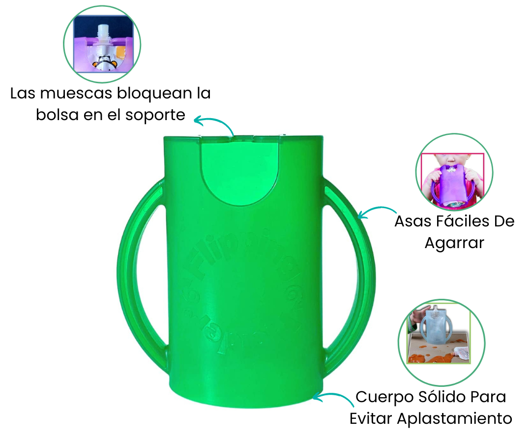 Es un soporte sin ensuciar y a prueba de compresiones para bolsas de alimentos, cajas de jugo y bolsas de jugo. Esta versión ORIGINAL tiene un fondo abierto para permitir un fácil acceso de los padres para ayudar al niño a comer de las bolsas de comida exprimibles. Con su diseño innovador, este soporte no solo mantiene las manos limpias, sino que también facilita la alimentación para padres y niños.