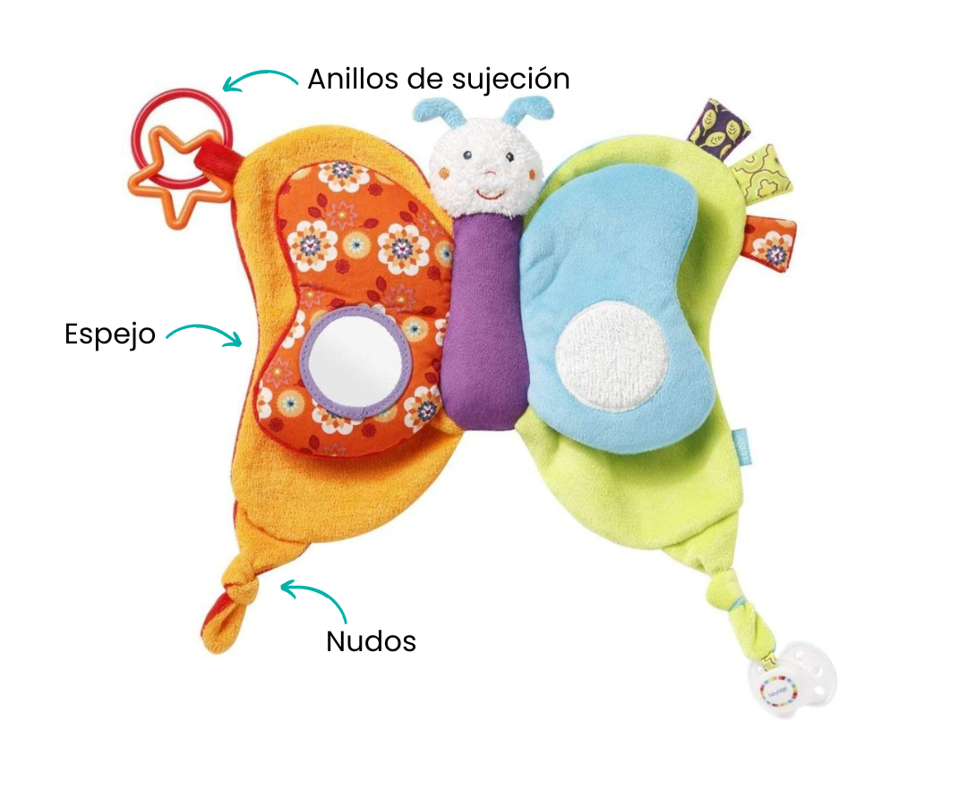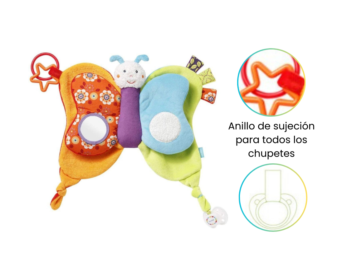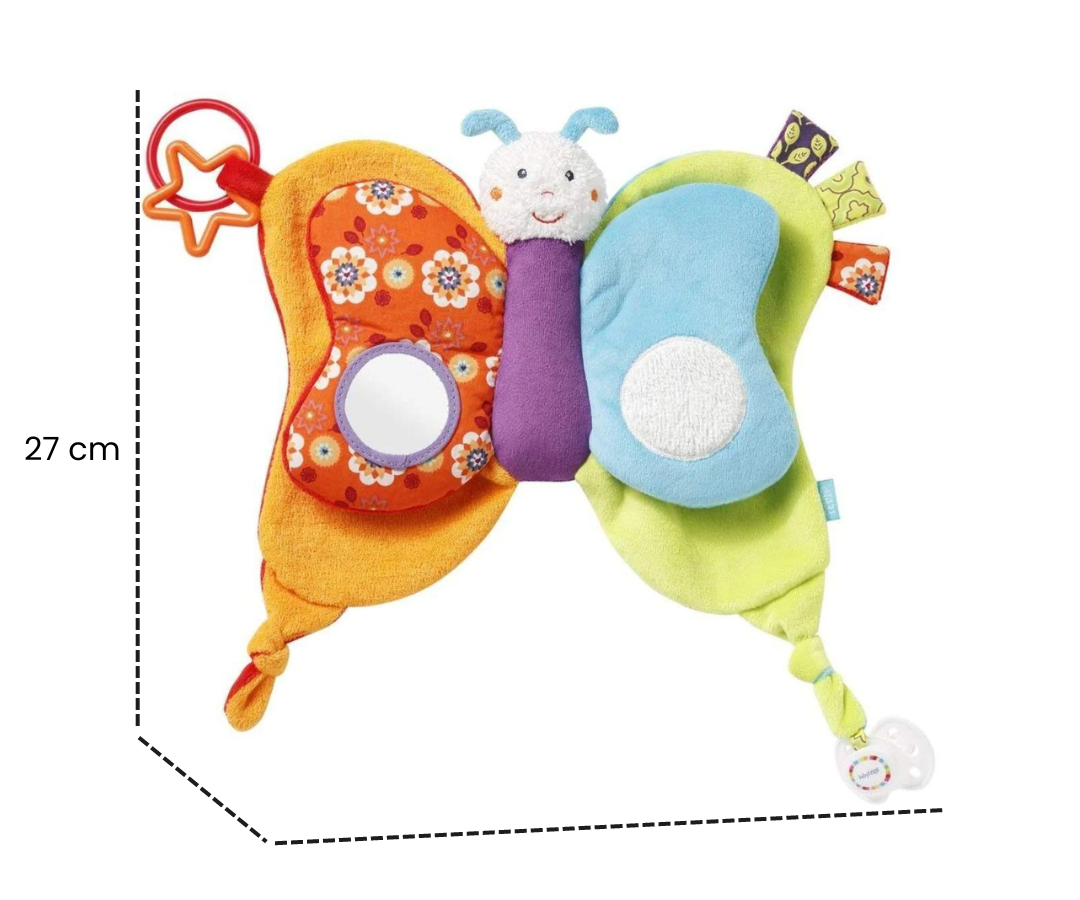 Esta adorable mariposa es más que un simple juguete, es un estímulo para que tu bebé abrace y explore el mundo que lo rodea. Con una variedad de texturas, esquinas y nudos, tu bebe sentirá curiosidad.