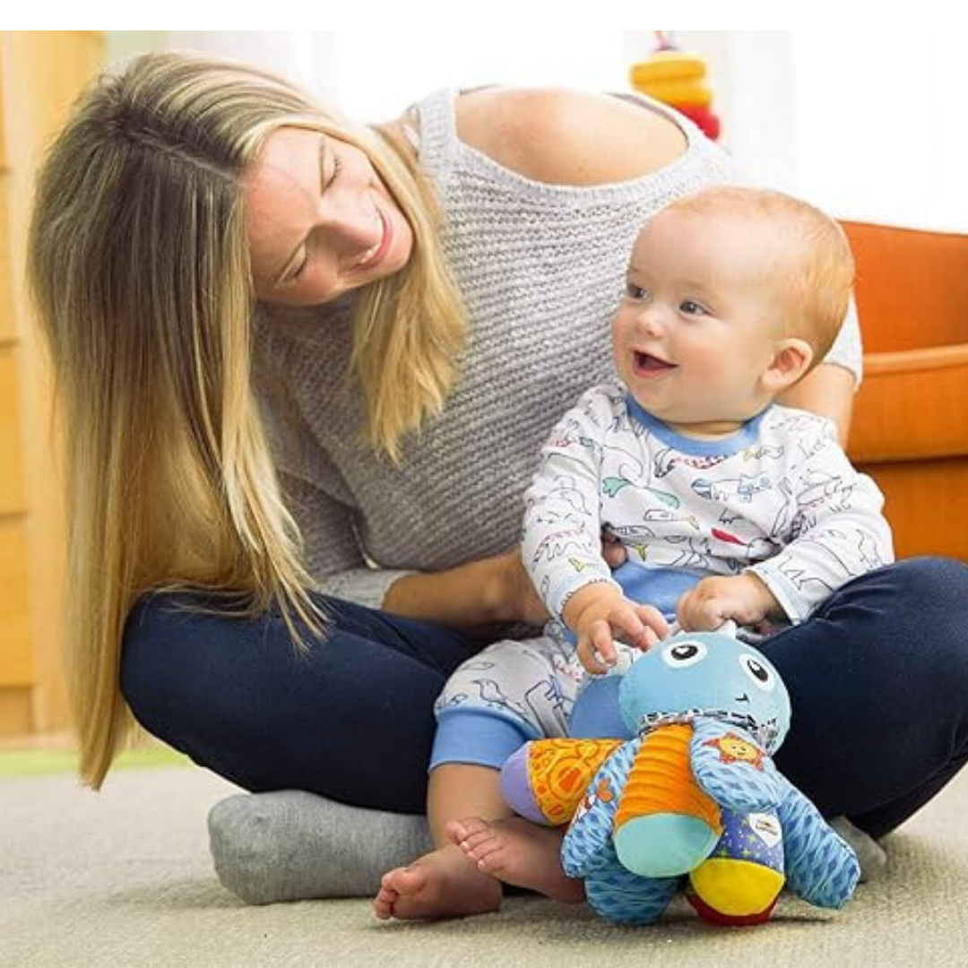¡Dale un abrazo para un sonido divertido también! Con un chirriante y un timbre, este juguete para bebé es perfecto para ayudar al bebé a desarrollar habilidades táctiles. El bonito pulpo también cuenta con patrones de alto contraste, espejo de peekaboo y colores brillantes que proporcionan al bebé estimulación visual durante el tiempo de juego.