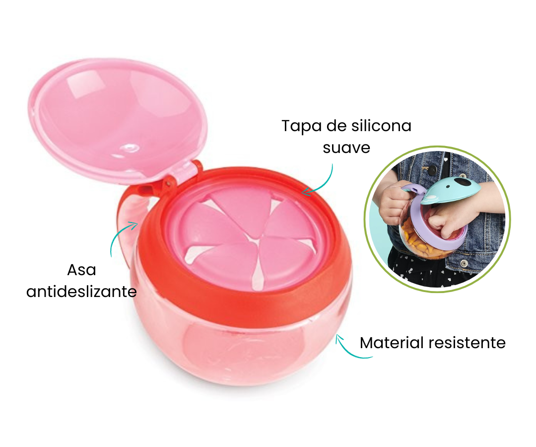 La apertura interior flexible evita que los snacks se derramen, incluso si se vuelca.