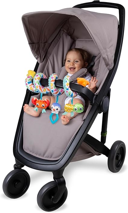 - Se puede fijar a la cuna, al coche o al asiento de auto para entretener al bebé mientras viaja.