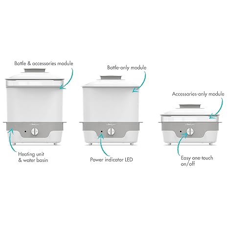 No hay necesidad de productos químicos agresivos o aditivos. El diseño modular, con dos bandejas, proporciona mucho espacio para esterilizar mientras ahorra espacio en el mostrador. La bandeja superior es perfecta para tetinas de biberón, mordedores de bebé, piezas de extractor de leche, chupetes y otros artículos más pequeños. La bandeja inferior está especialmente diseñada para botellas, tazas y artículos más grandes. Use cualquiera de las bandejas, o ambas dependiendo de sus necesidades para el día. El diseño inteligente de la bandeja inferior dirige el vapor profundamente dentro de las botellas y ambas bandejas circulan completamente el vapor para asegurarse de que cada superficie esté cubierta. Este esterilizador de vapor funciona como un práctico espacio de almacenamiento, manteniendo las cosas en el interior esterilizadas hasta por 24 horas.