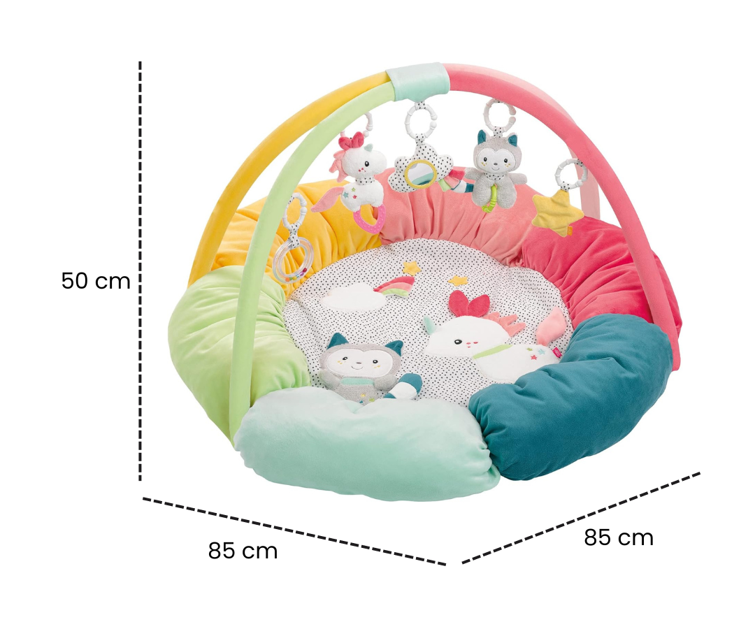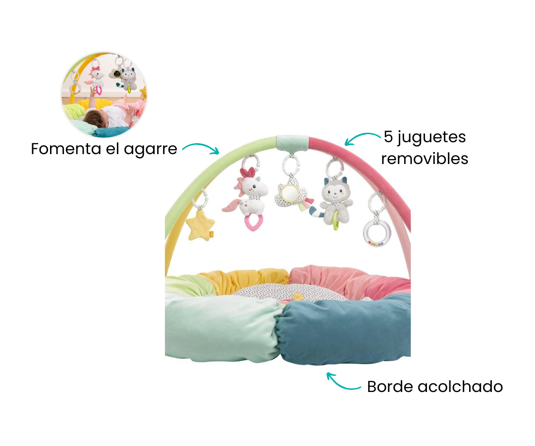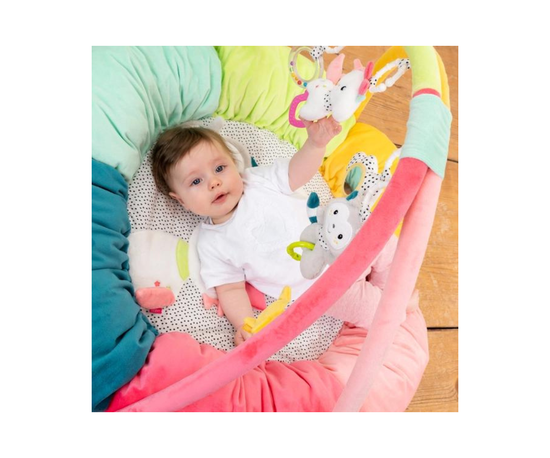 Aventúrate en el colorido mundo del unicornio y el gato. Descubre un viaje sensorial que estimula los sentidos de tu pequeño mientras juega. Con 5 juguetes removibles que promueven el agarre y el tacto, este nido proporciona la comodidad óptima para tumbarse y echarse una siesta gracias a su borde acolchado.
