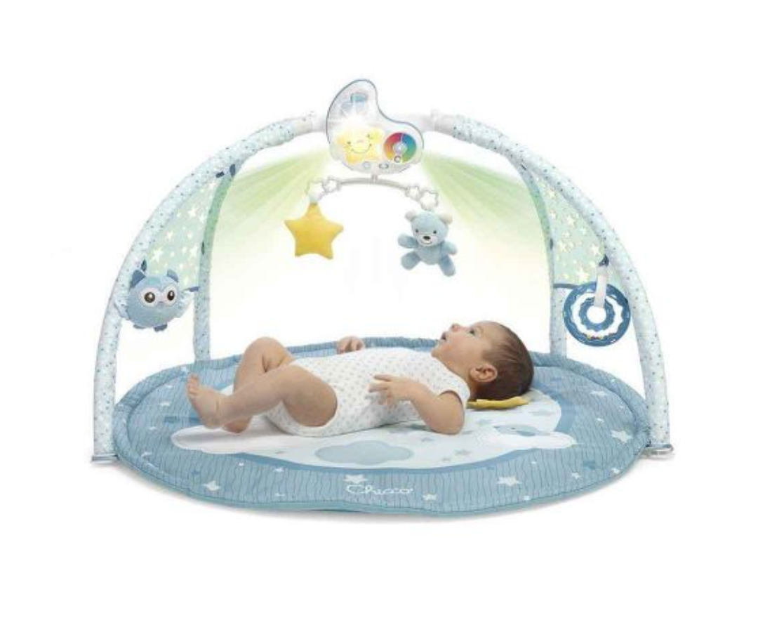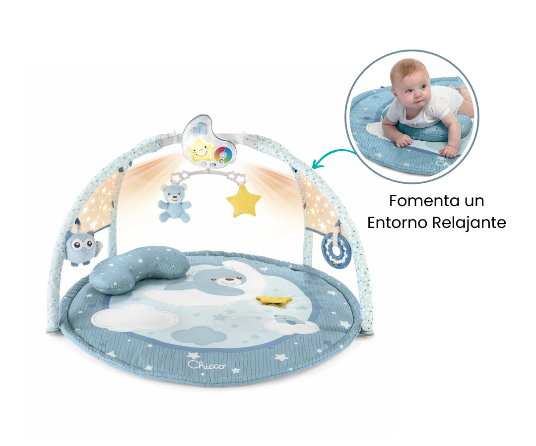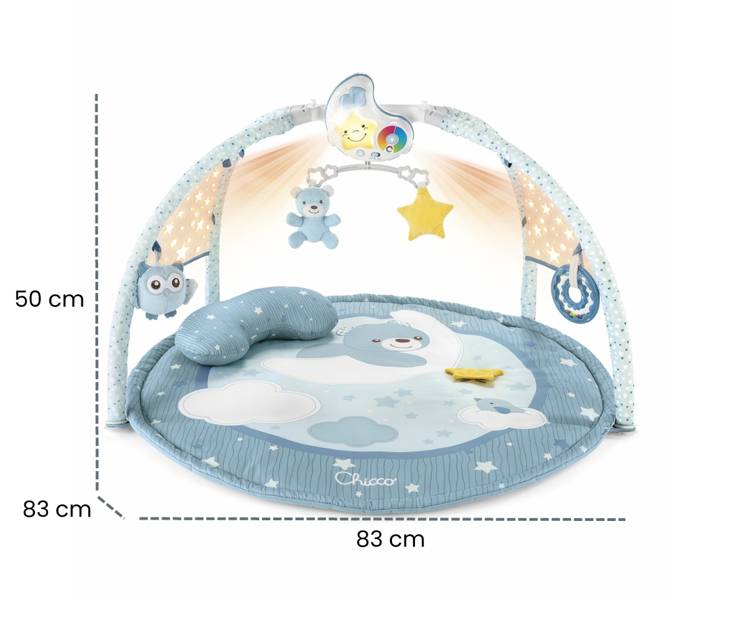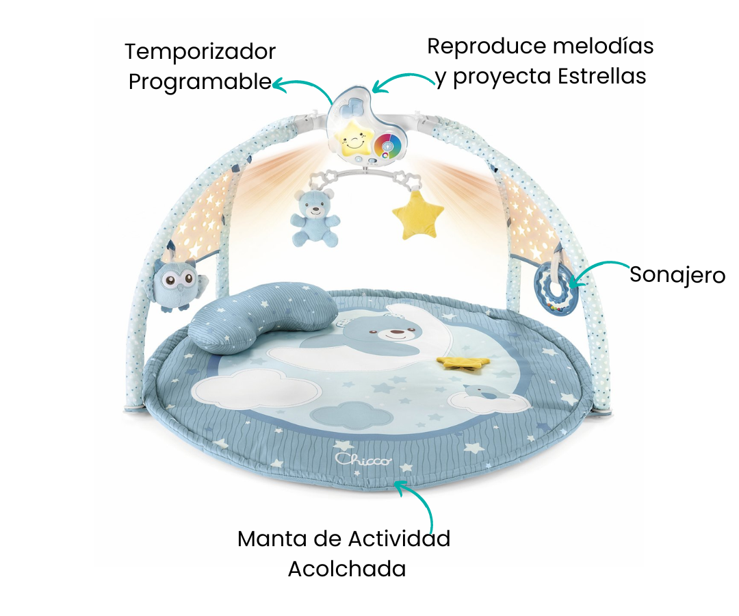 El gimnasio First Dreams Goodnight Stars de Chicco es un compañero indispensable para las horas de sueño de tu bebé. Con su proyección de estrellas y luz suave, junto con una selección de melodías tranquilas, crea un ambiente perfecto para noches serenas y siestas reconfortantes.