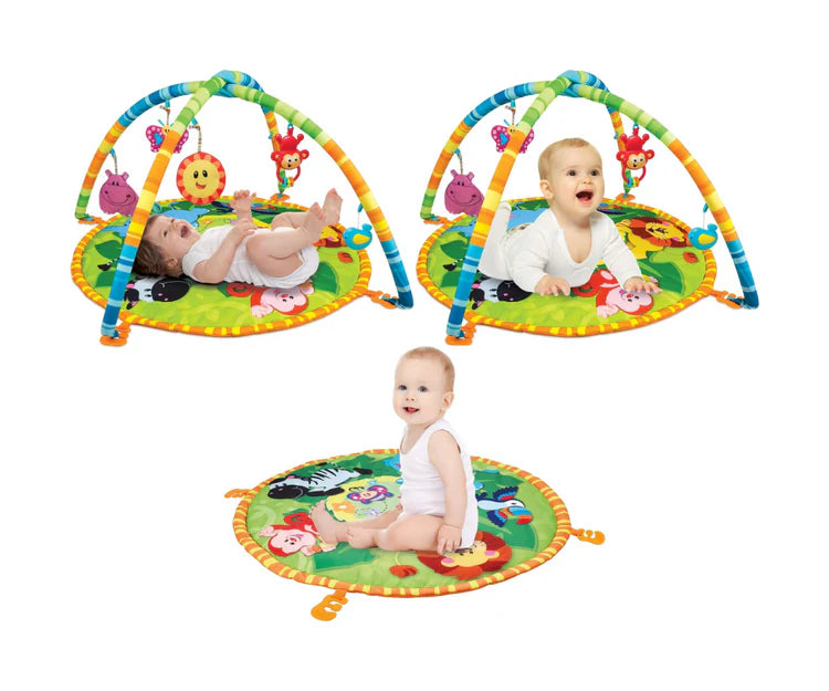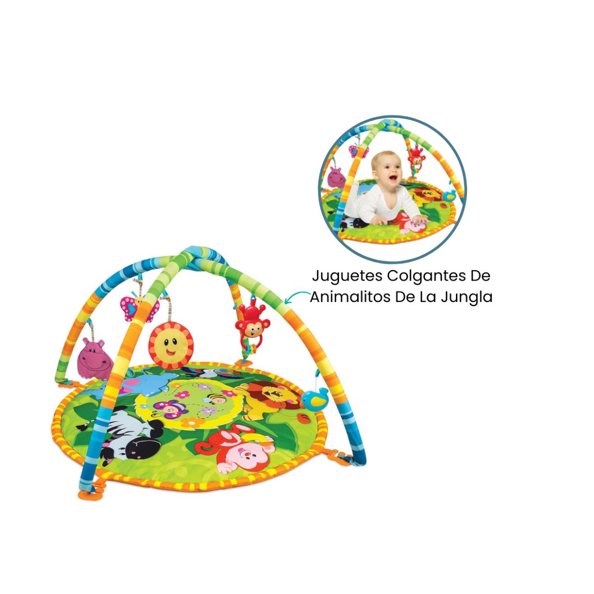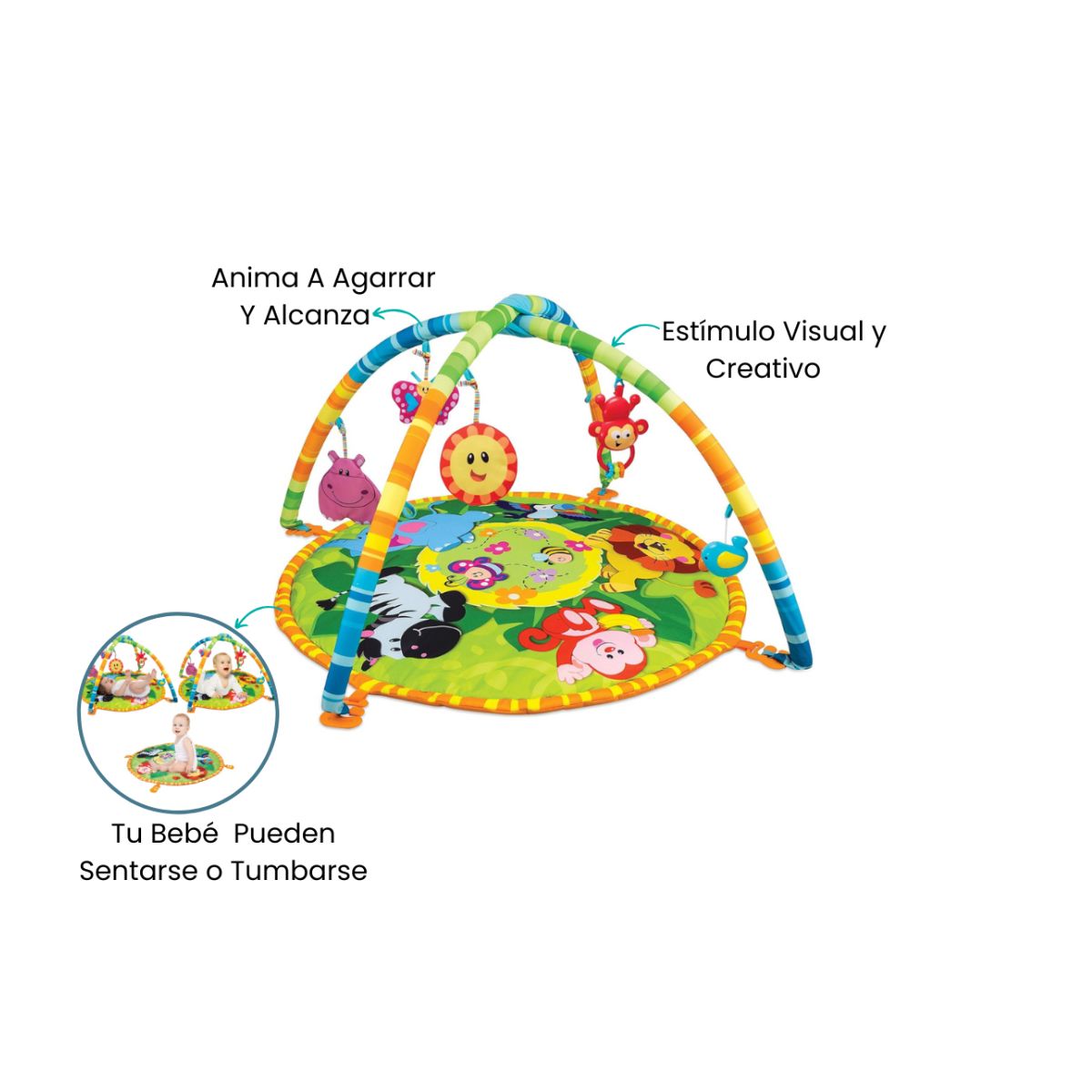 La alfombra de juego para bebé ofrece una superficie cómoda y segura donde los más pequeños pueden sentarse o tumbarse. Los juguetes colgantes animan a los bebés a agarrar y alcanzar, la combinación de colores vibrantes y diseños encantadores hacen que esta alfombra sea una superficie colorida que deleitará a los bebés.