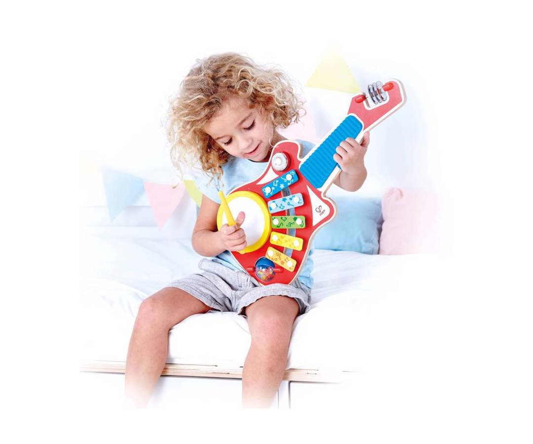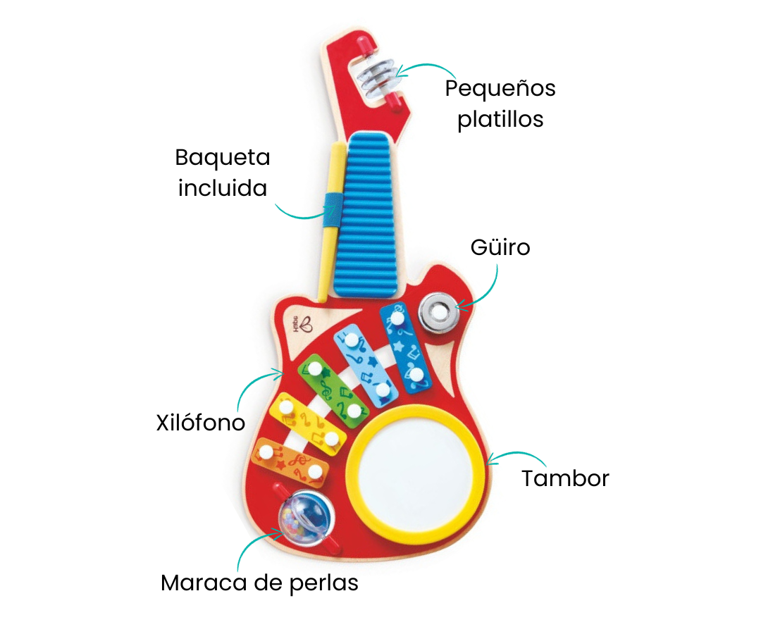 Con la apariencia de una guitarra clásica, esta maravillosa creación de Hape incluye un tambor, un xilófono y dos platillos, junto con la magia del giro y el sonido de una maraca de perlas.