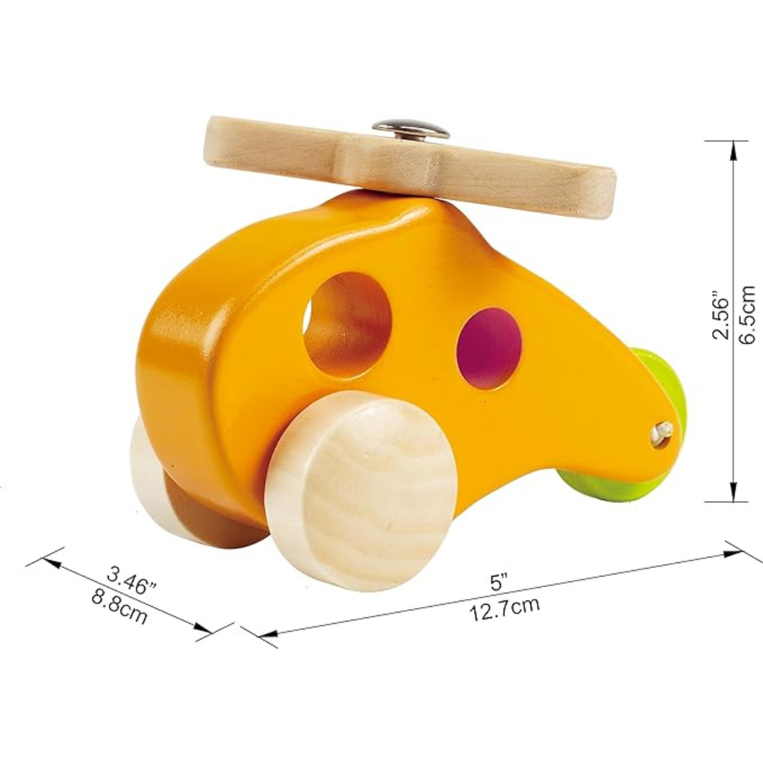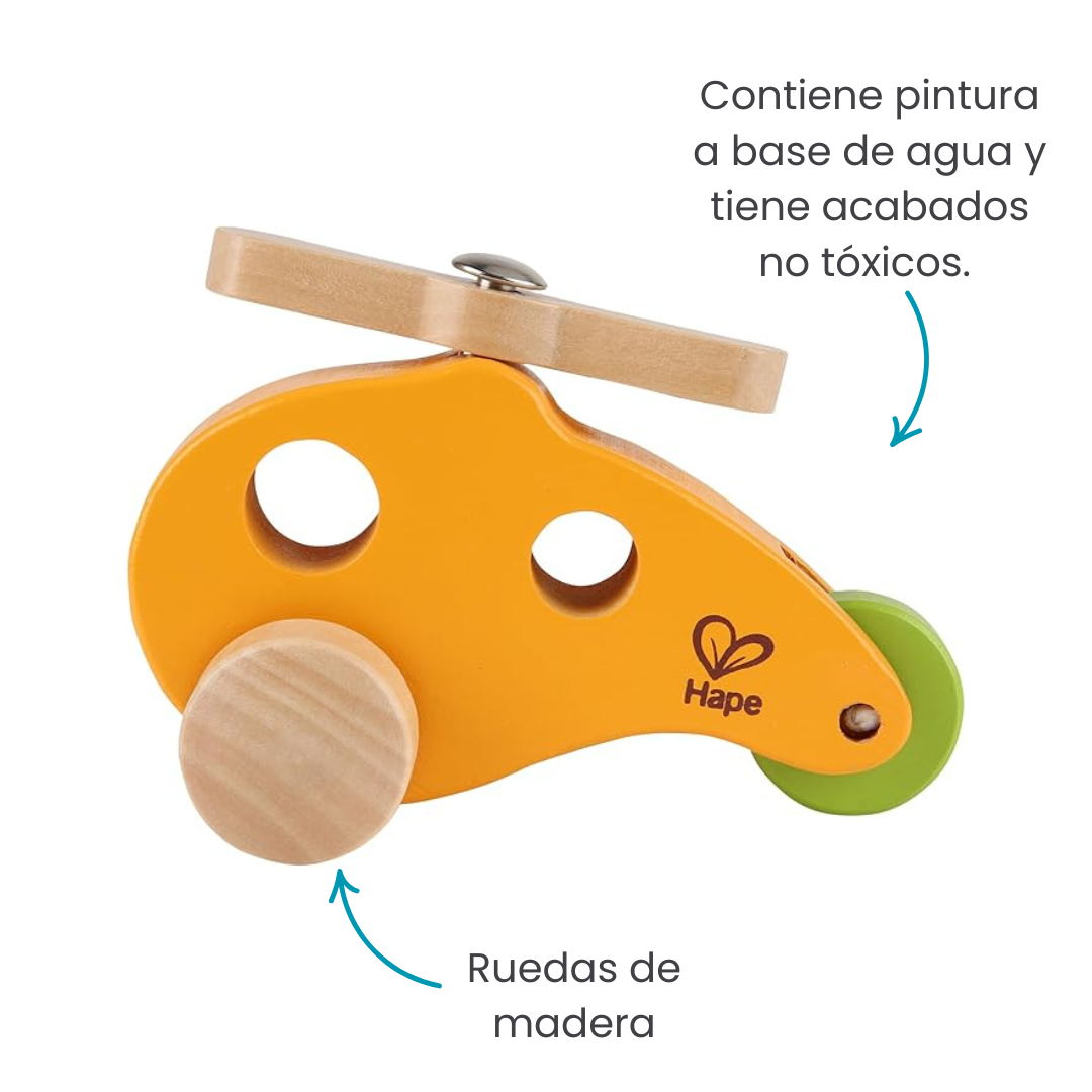 Su diseño impecable, con bordes suaves y redondeados, ruedas totalmente funcionales y una hélice giratoria, estimula tanto la motricidad fina como la imaginación. 14 cm x 9 cm de alto. Para niños de 10 meses a 2 años.