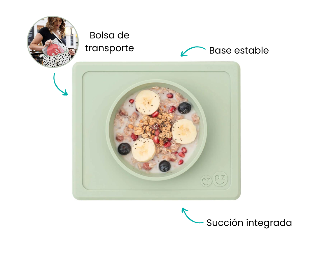 El Bowl está cuidadosamente diseñado para encajar en las bandejas de tronas más pequeñas, facilitando las primeras comidas del bebé, desde purés hasta cereales y favoreciendo el método de alimentación baby-led weaning.