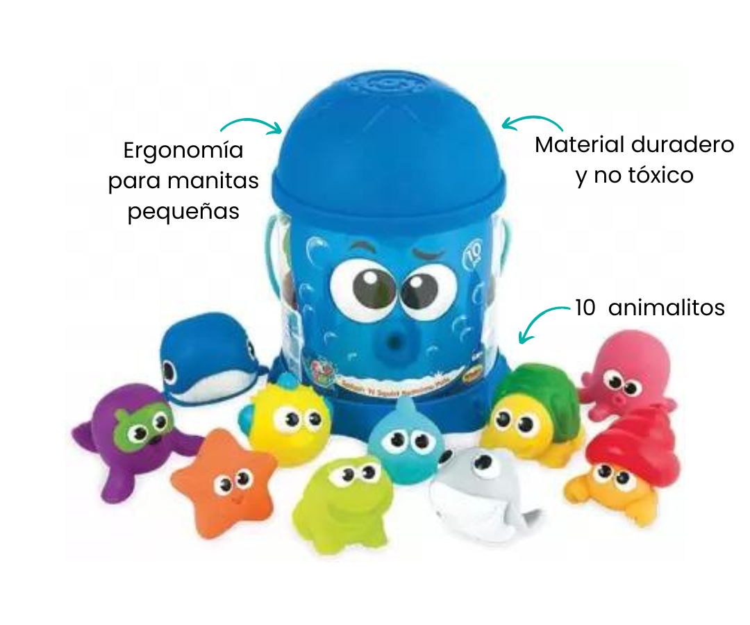 Tu niño disfrutará cada instante en el agua junto a estos divertidos animalitos. Cada juguete ha sido cuidadosamente diseñado para adaptarse a las manitas de los pequeños, permitiéndoles agarrar y apretar mientras exploran el reino acuático.