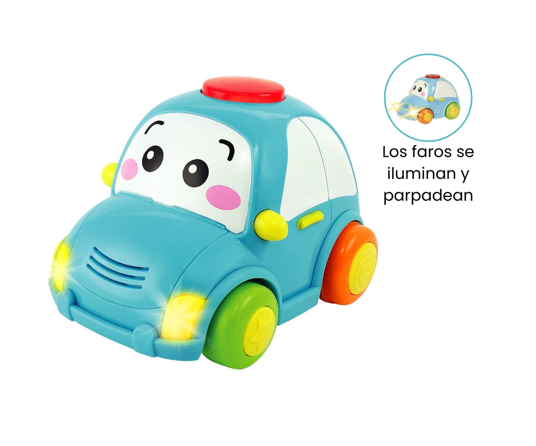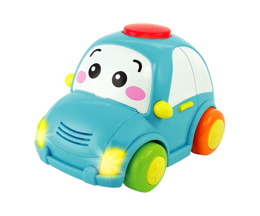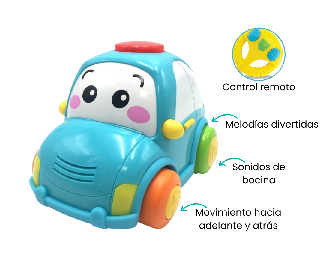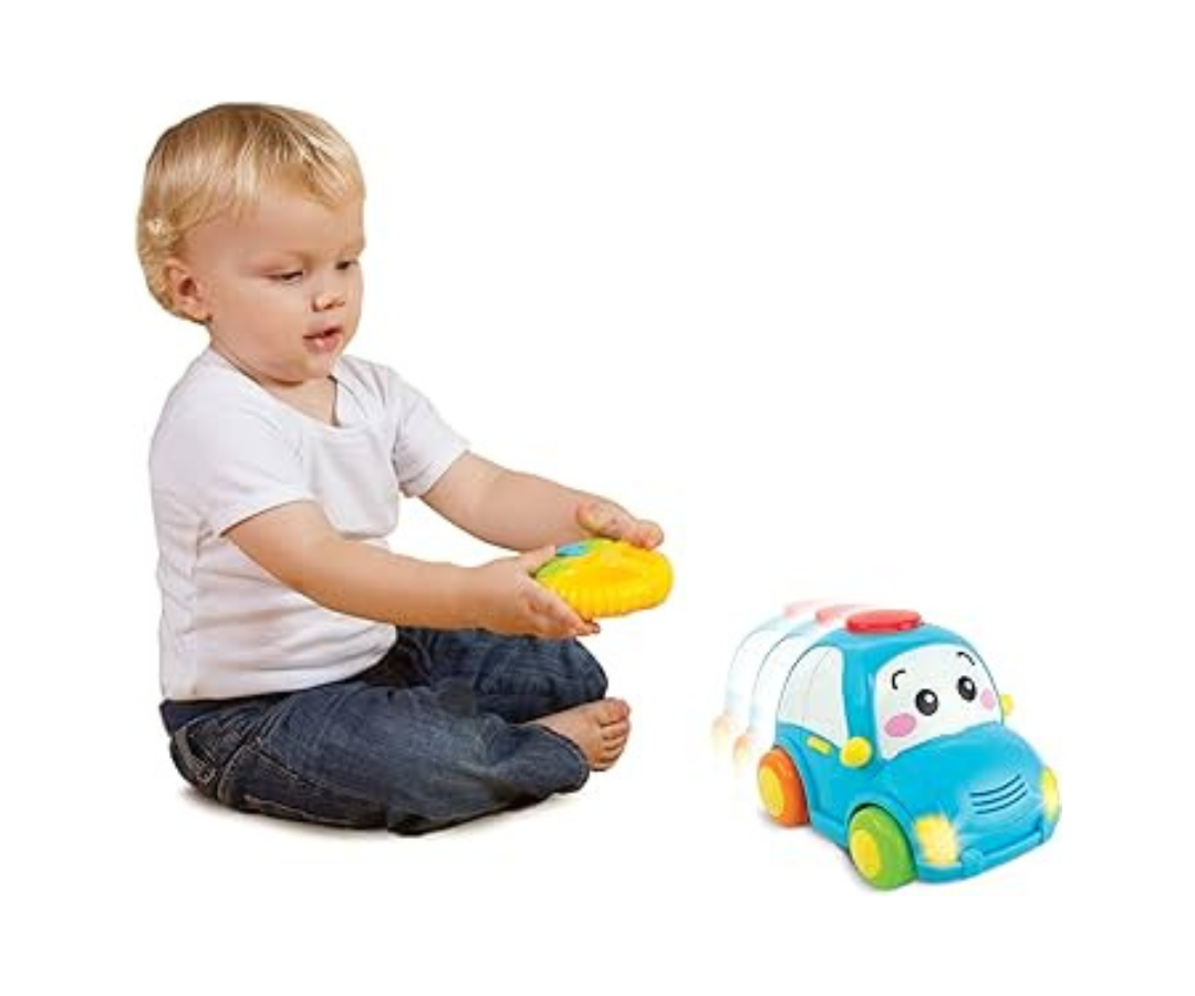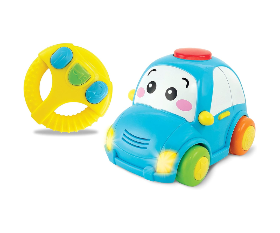 El coche con luces y sonidos con control remoto de WINFUN es un vehículo con control remoto perfecto. El controlador con forma de volante conduce el lindo y sonriente auto hacia adelante o hacia atrás.