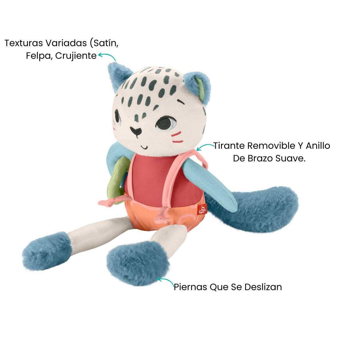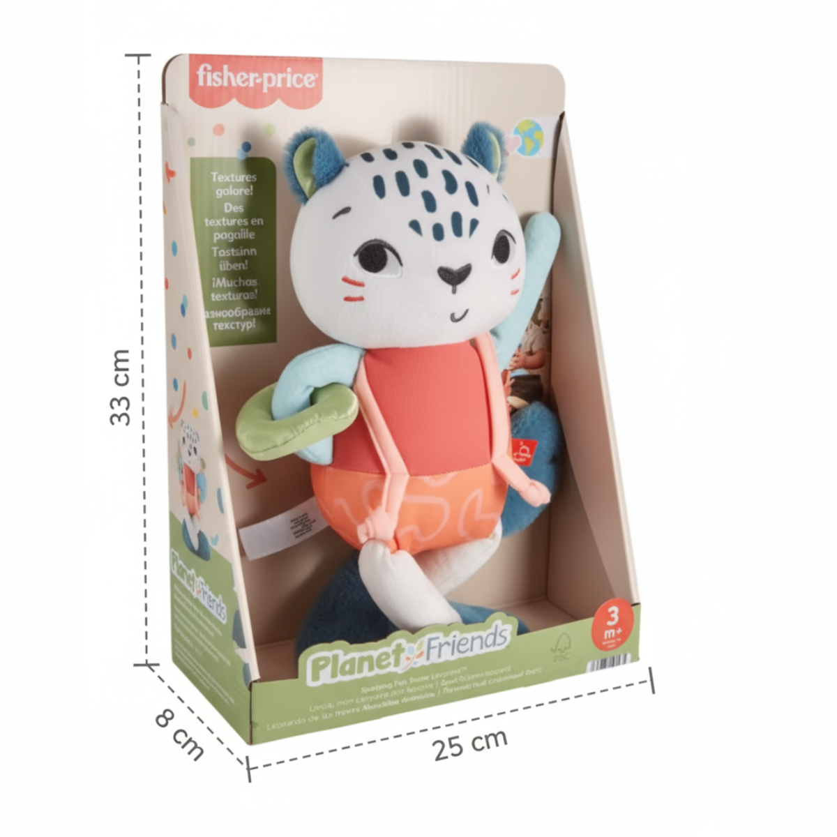 El Peluche Sensorial Planet Friends Snow Leopard Fisher-Price®, inspirado en los animales destacados por el Fondo Mundial para la Naturaleza (WWF), invita a tu bebé a descubrir un mundo de texturas, sonidos y colores mientras fomenta el cuidado del planeta. Fabricado con 95 % de plástico reciclado posconsumo y presentado en un empaque con certificación FSC, este adorable leopardo de las nieves combina aprendizaje, sostenibilidad y ternura.