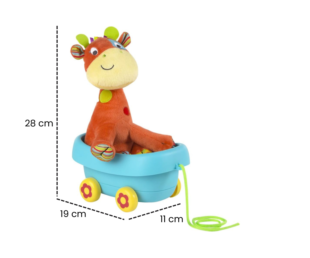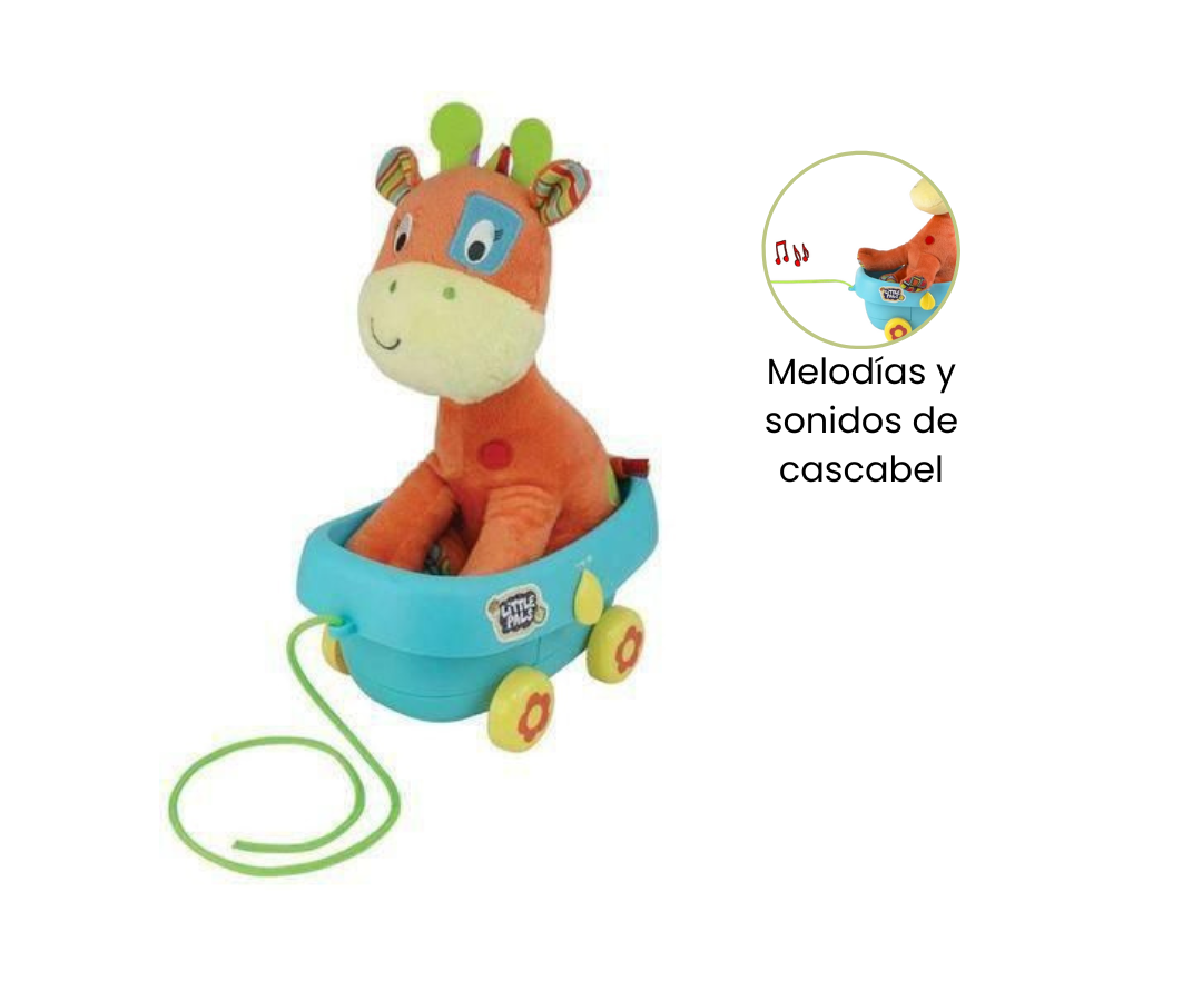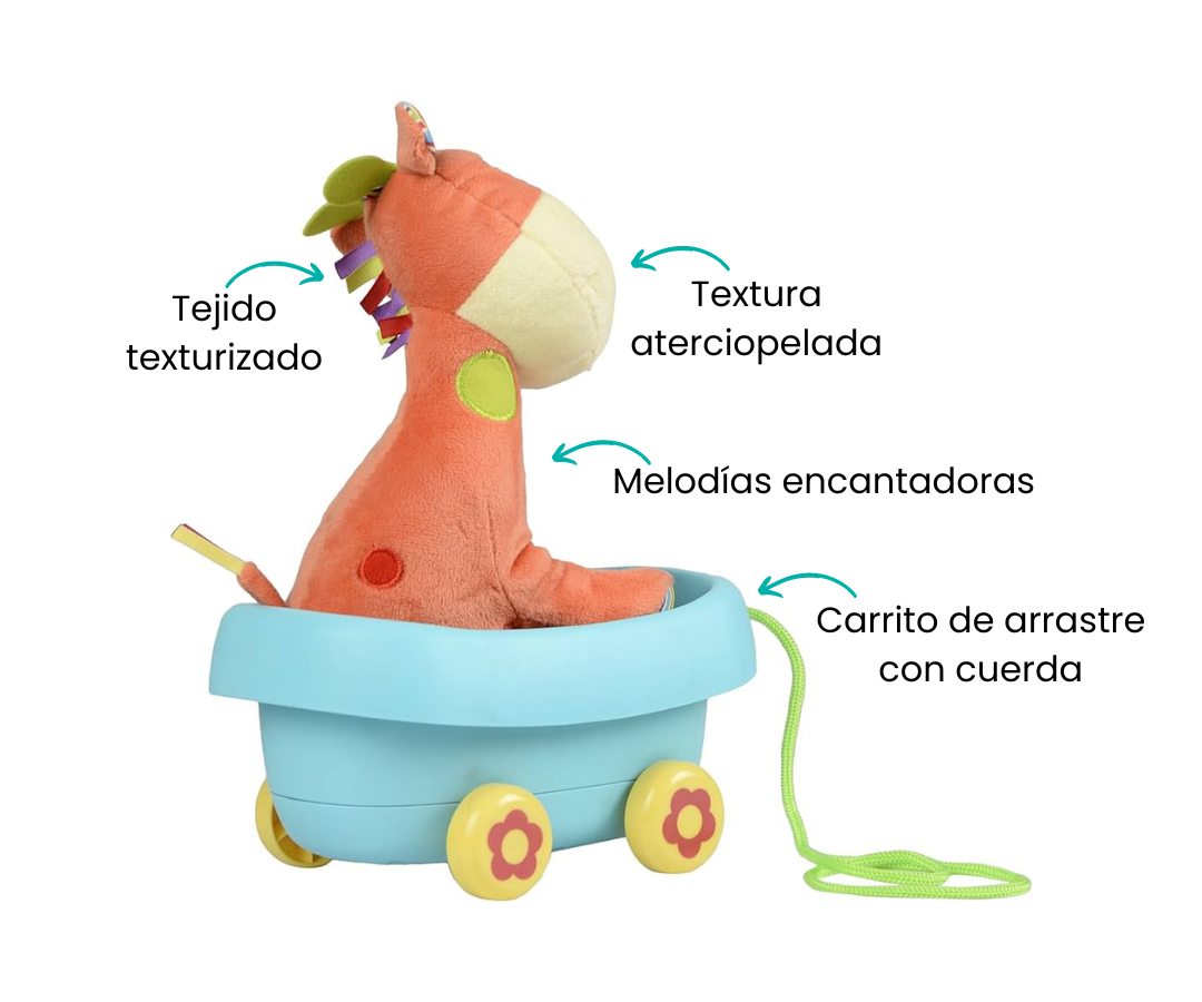 Esta adorable jirafa de peluche tiene una suavidad y textura aterciopelada y hacen que sea el compañero perfecto para tus paseos, mientras tiras de su carrito y descubres un mundo de diversión. Con sonidos alegres y melodías encantadoras, esta jirafa es mucho más que un juguete, es una experiencia sensorial que estimula la curiosidad de tu pequeño.