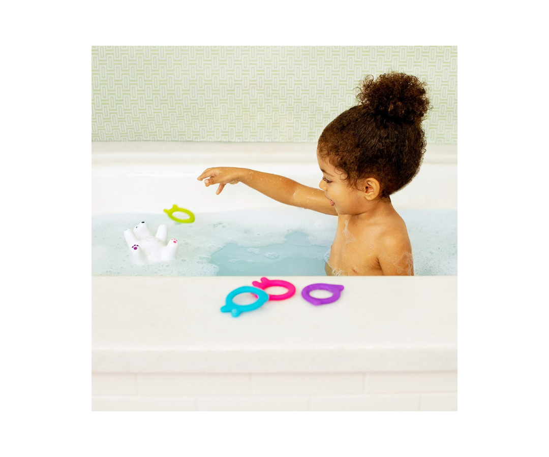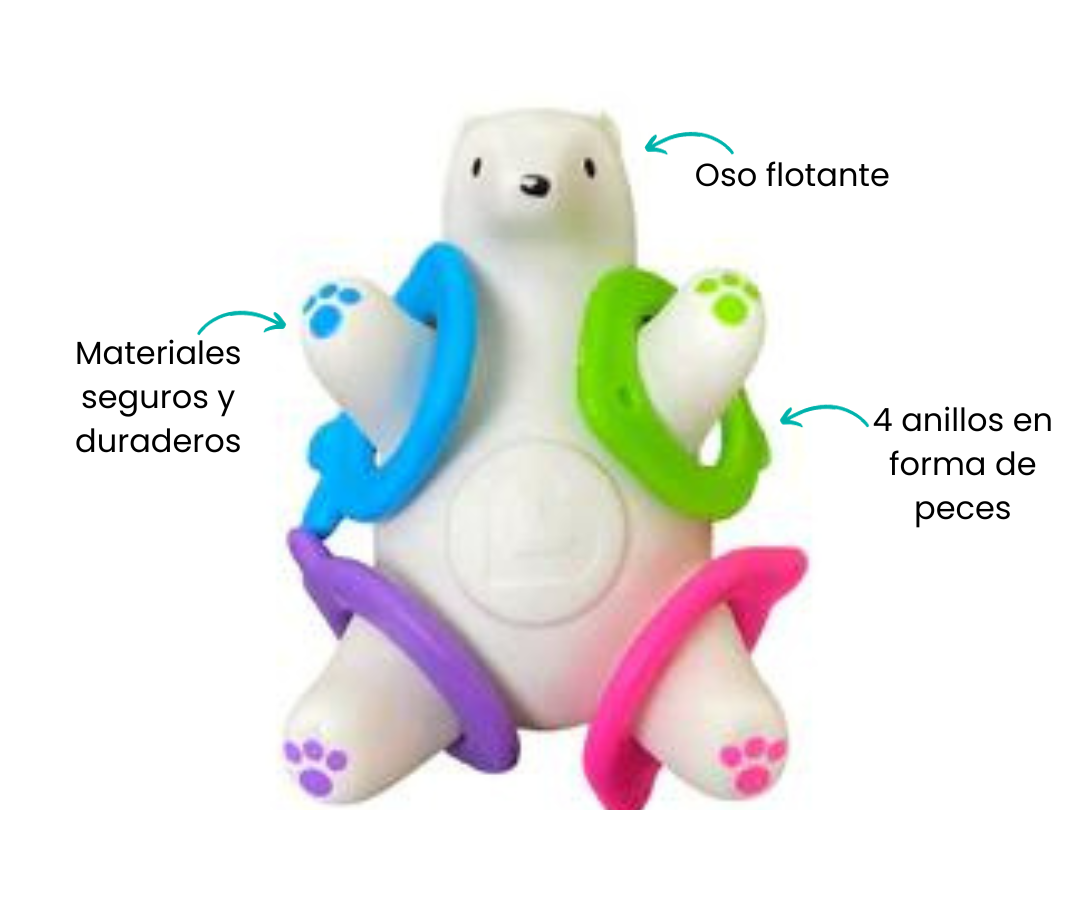 Este oso de juguete flotante y 4 encantadores anillos con personajes de peces, promueve la destreza y la coordinación y también invita a los pequeños a sumergirse en un mundo imaginario lleno de desafíos y risas.