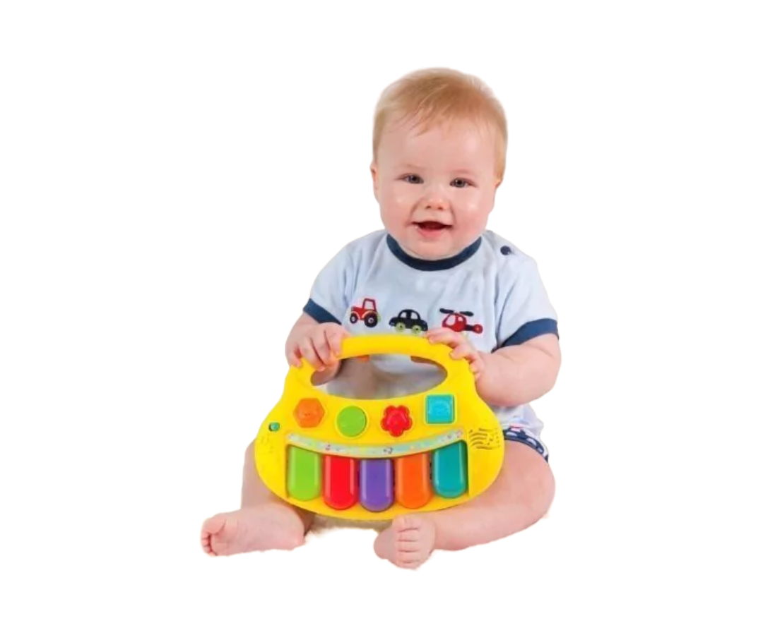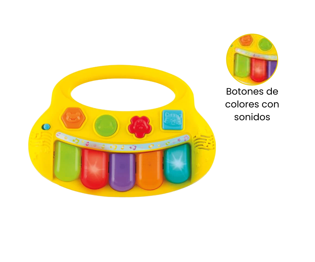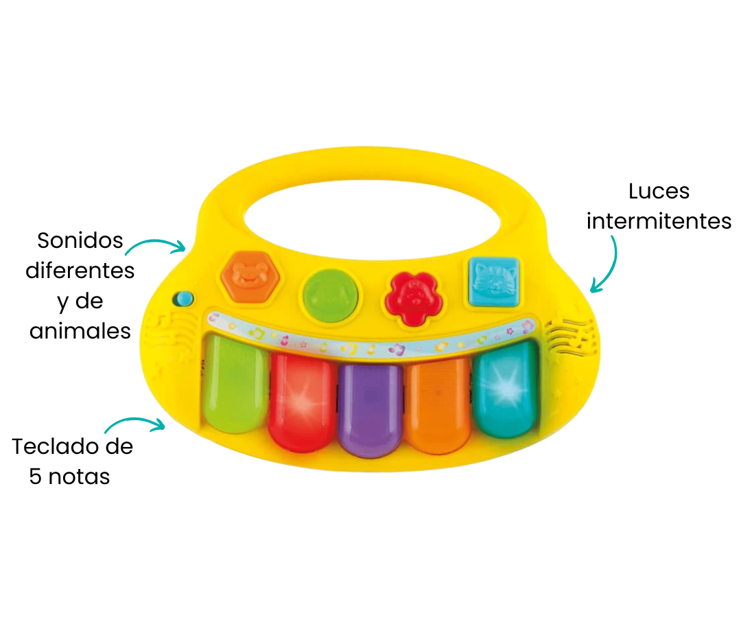 Descubre la magia de la música y la diversión con el juguete que adopta la forma de un encantador piano. Este adorable instrumento presenta un teclado de 5 notas con luces intermitentes, diseñado para introducir a tu hijo en el fascinante mundo de las notas, sonidos y colores de una manera lúdica y educativa.