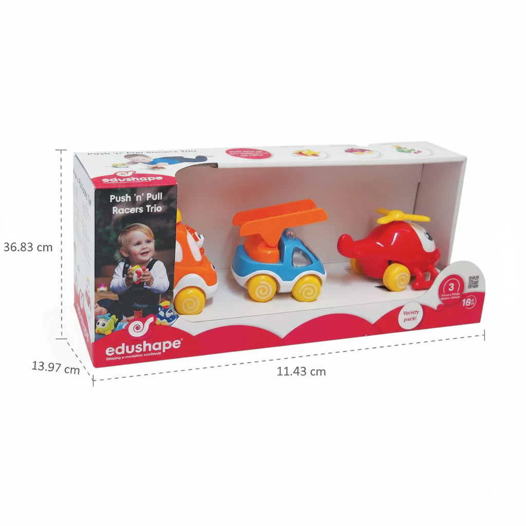 El trío de carreras de empuje y tracción Edushape convierte el juego en una experiencia de descubrimiento. Al tirar, empujar o presionar los vehículos, los niños aprenden sobre causa y efecto de forma divertida. Estimula la coordinación ojo-mano y la motricidad gruesa mientras se divierten explorando el movimiento. ¡Una manera perfecta de aprender física jugando!