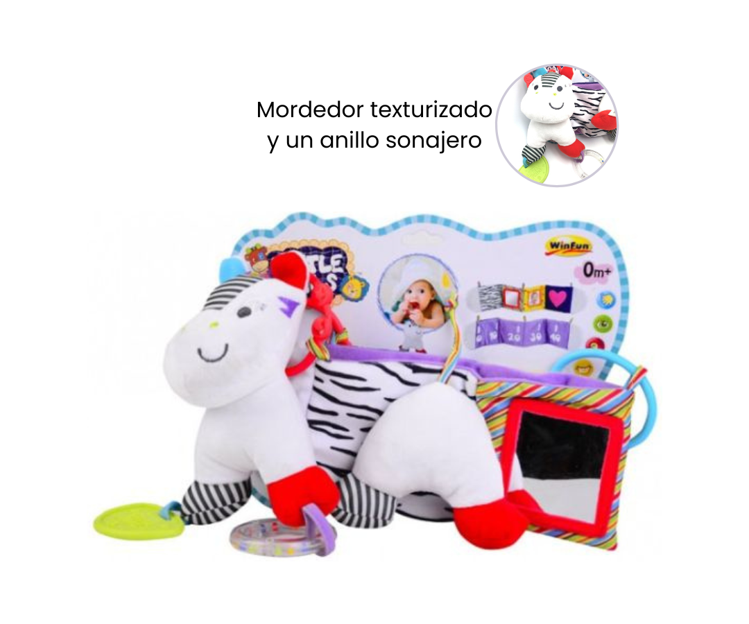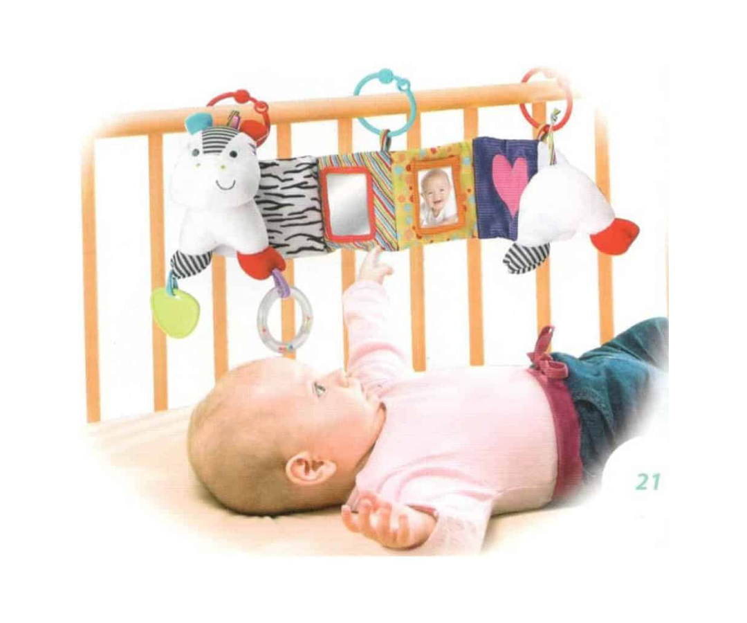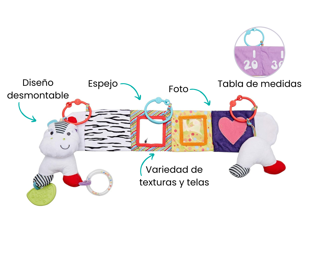 La funda para fotos y espejo para bebés, ofrece una experiencia multisensorial con múltiples texturas. Incorpora una tabla de altura para medir el crecimiento del bebé. Es desmontable y permite llevarlo fácilmente y sujetarlo a la cuna para cualquier momento del día.