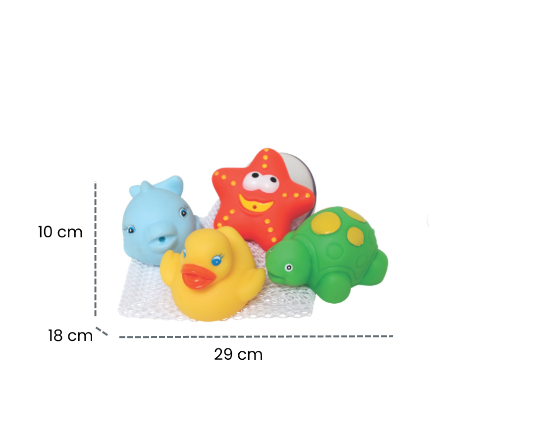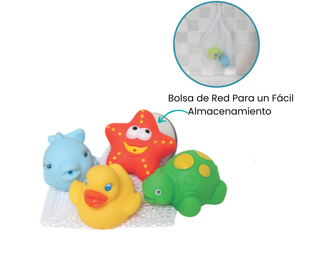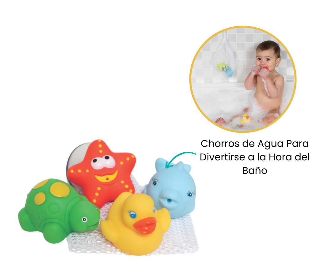 Este encantador set incluye cuatro juguetes de baño en forma de animales, cada uno diseñado para divertir y estimular los sentidos del bebé. Además, Los juguetes acuáticos, con formas coloridas y divertidas, harán que la hora del baño sea un momento emocionante y educativo para tu pequeño. Cada animalito tiene características únicas que capturan la atención del bebé, estimulando su curiosidad y desarrollando sus sentidos.