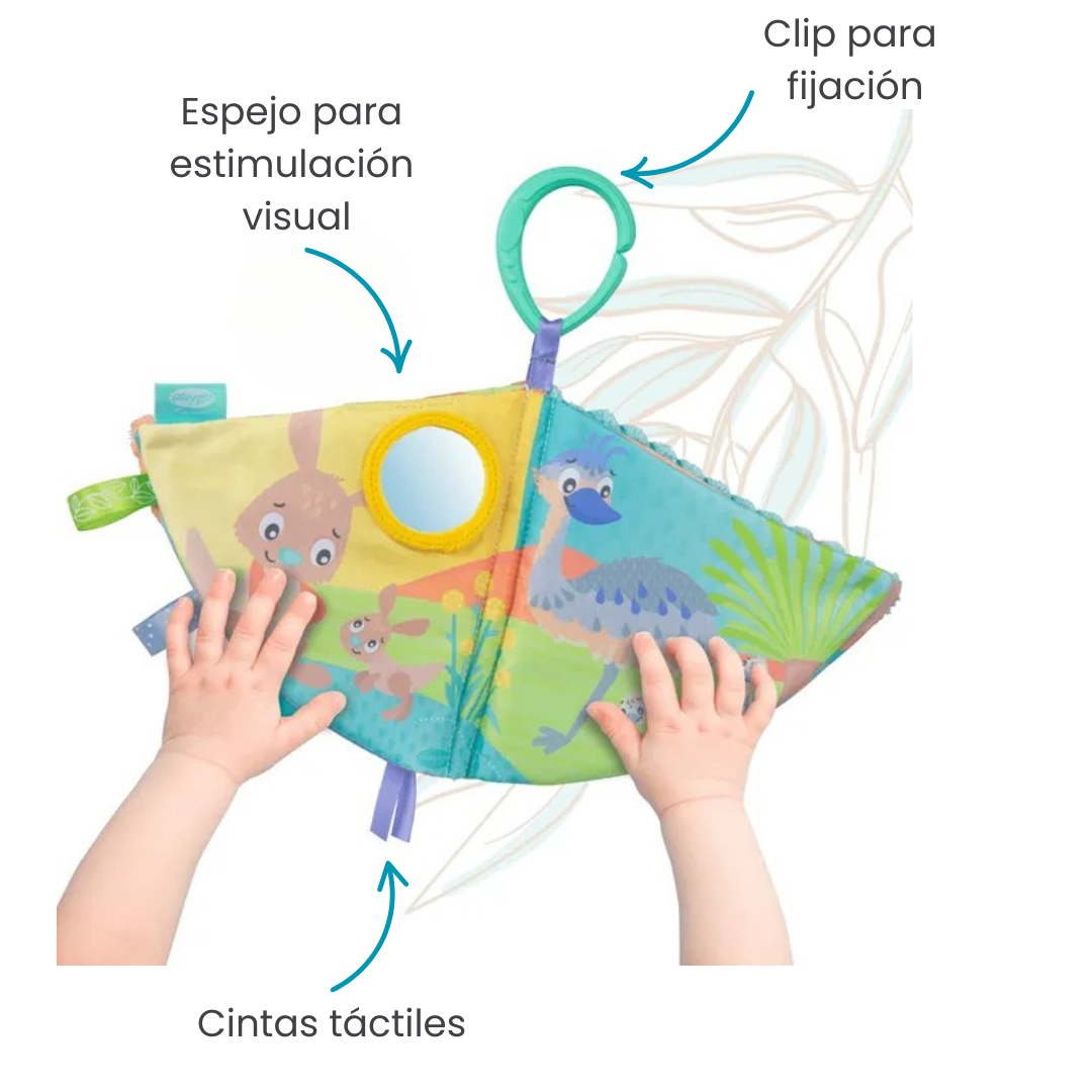 Este libro sensorial incluye un mordedor suave y un clip seguro para sujetarlo fácilmente al cochecito o a la cápsula.